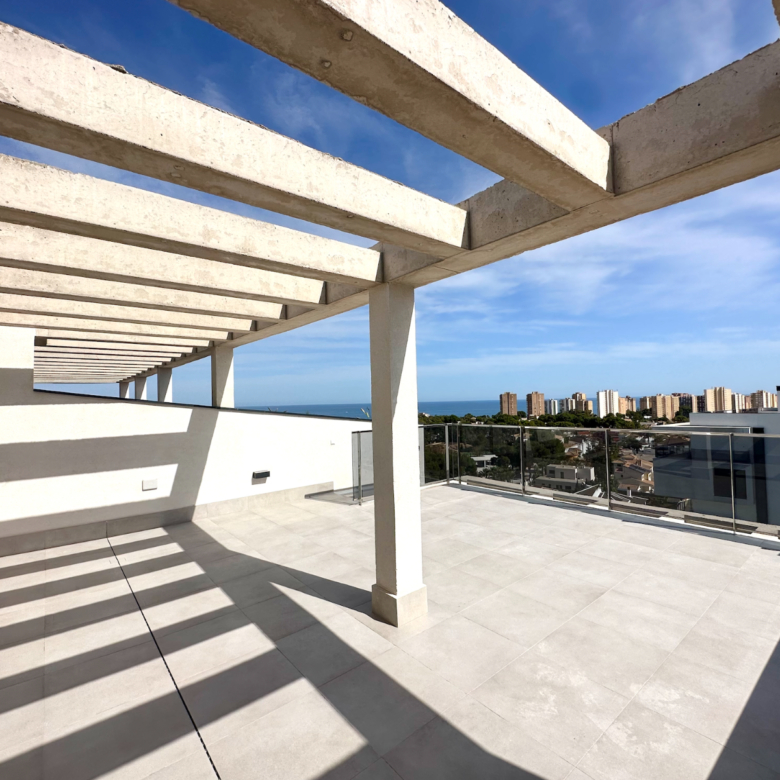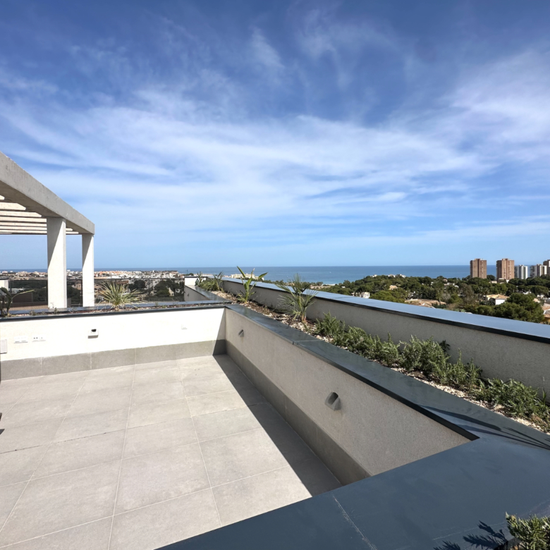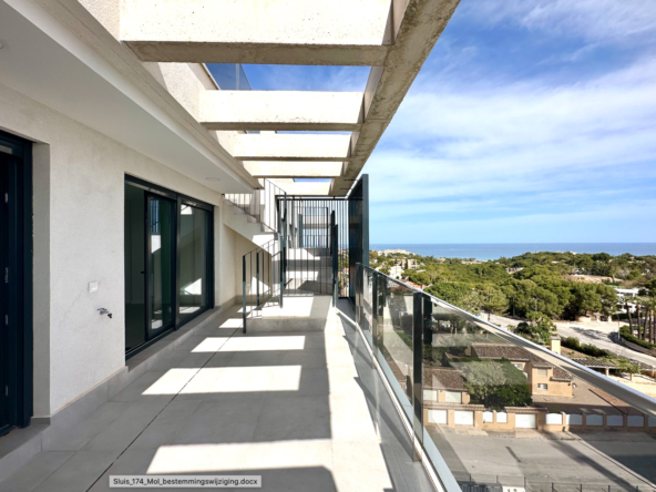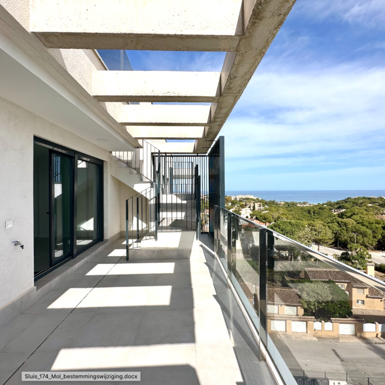 Schuiframen in de woonkamer en de meester slaapkamer leiden naar het terras, waar u kunt genieten van het weidse uitzicht en de verfrissende bries. Maar het echte hoogtepunt wacht op u op het solarium, bereikbaar via een trap vanaf het terras. Hier kunt u uw eigen oase van ontspanning creëren, met ruimte voor een buitenkeuken en zelfs een jacuzzi, perfect om te genieten van de zonnige dagen en de prachtige zonsondergangen.