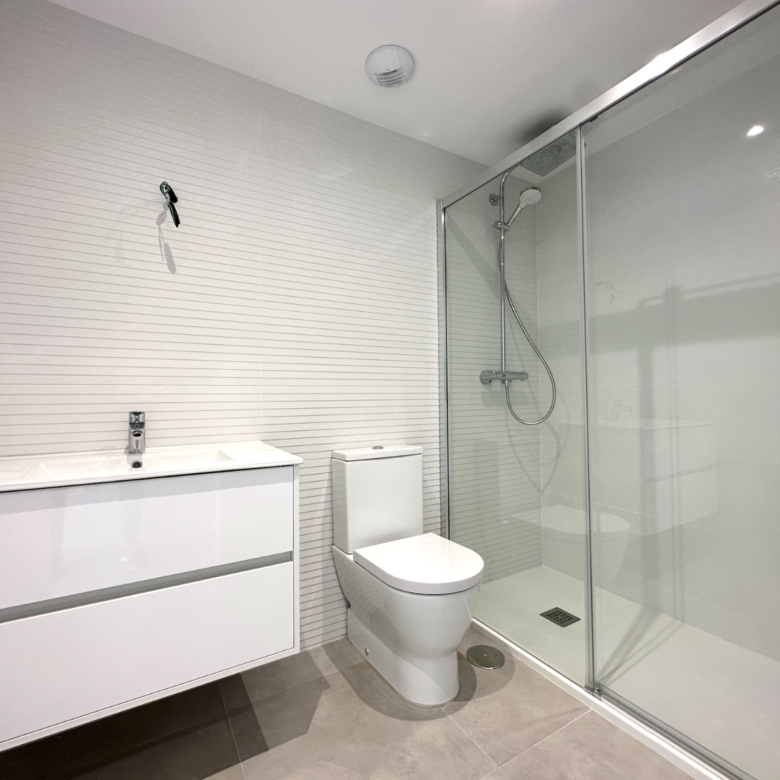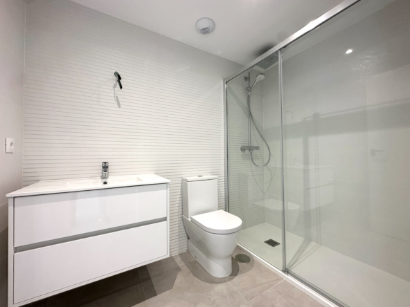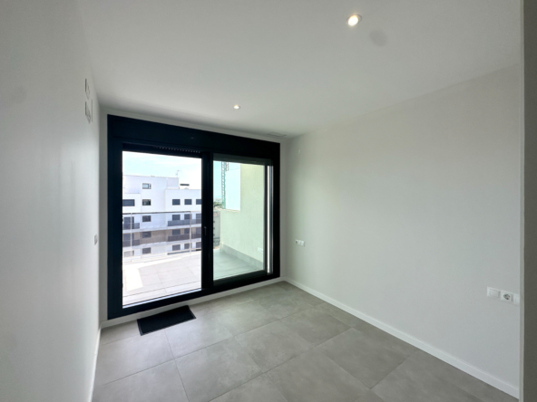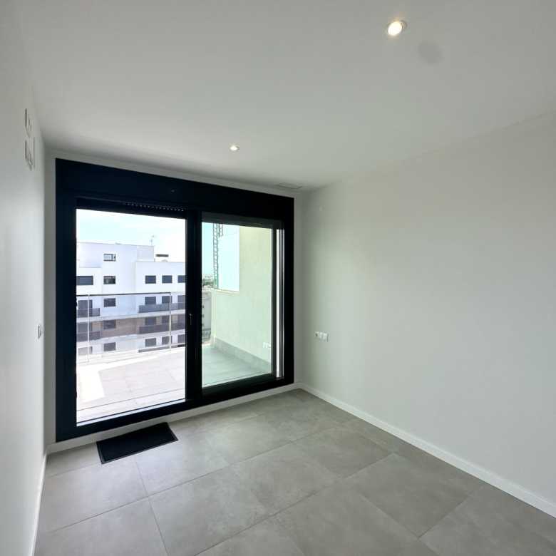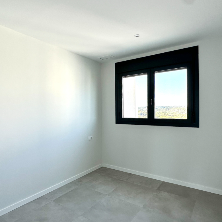 Dit penthouse biedt in totaal drie slaapkamers en twee badkamers, elk met moderne voorzieningen zoals wastafel, inloopdouche en toilet. De twee achterste slaapkamers hebben ook hun eigen balkon, waar u kunt genieten van het prachtige uitzicht op het omliggende landschap.
