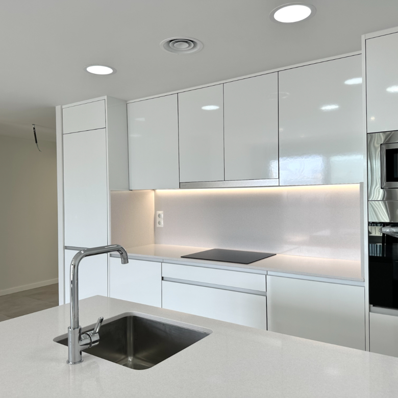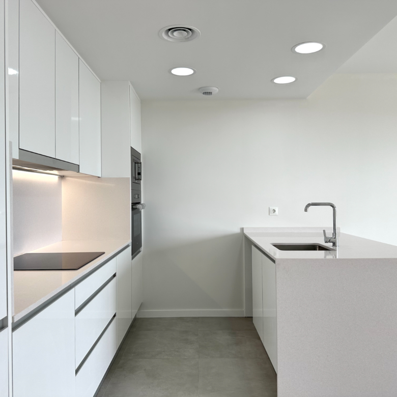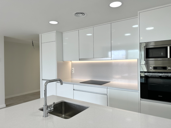 Bij het betreden van het appartement wordt u begroet door een royale inkomhal, voorzien van grote maatkasten die perfect zijn ontworpen om al uw bezittingen netjes op te bergen. De leefruimte ademt een sfeer van elegantie en ruimte, met een open keuken met eiland en inbouwapparatuur, ideaal voor kookliefhebbers.