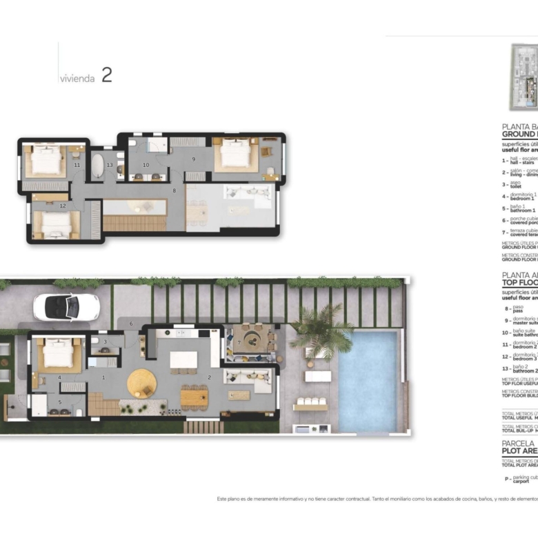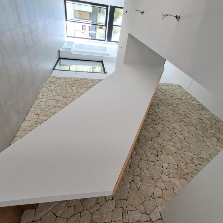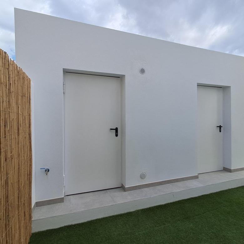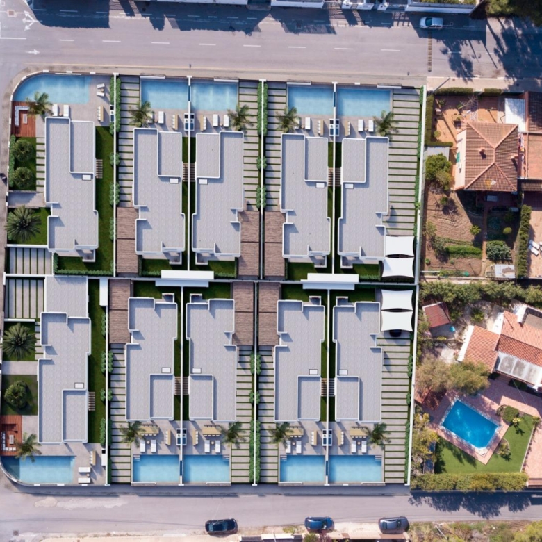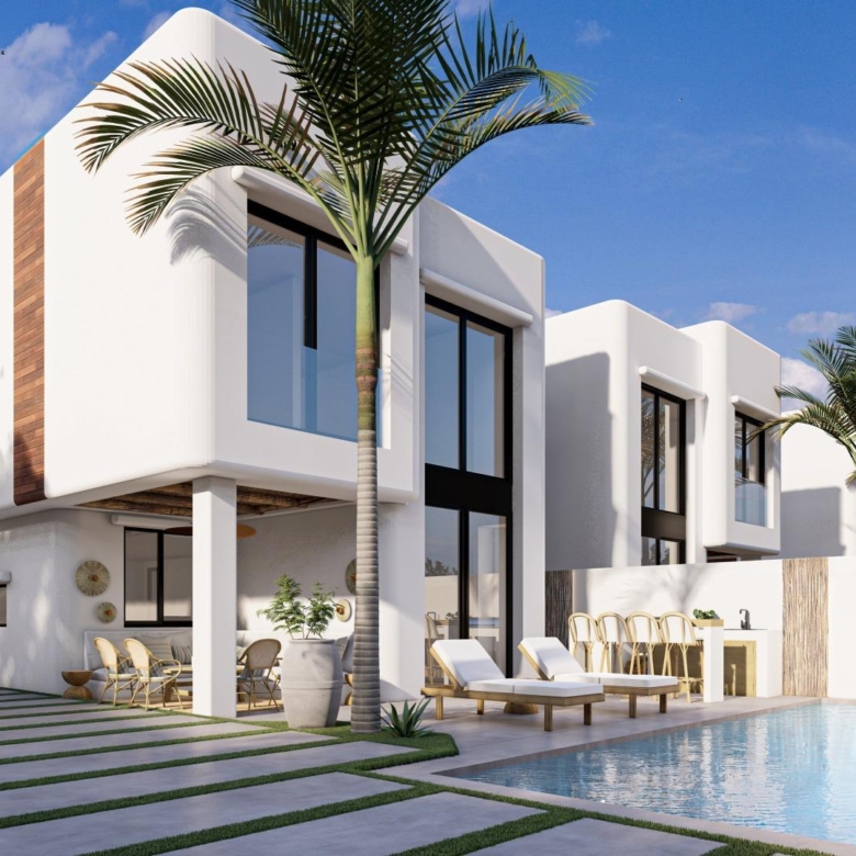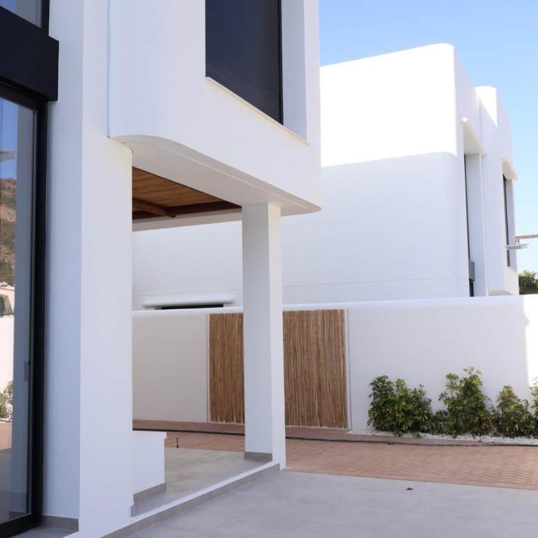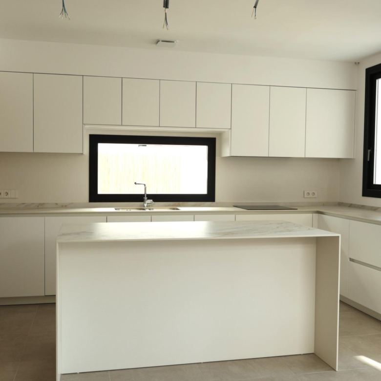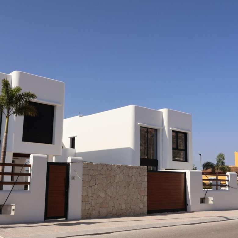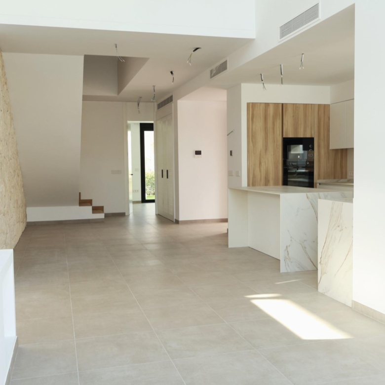 De villa’s bieden vier royale slaapkamers, drie badkamers en een gastentoilet, verdeeld over twee verdiepingen. De open woon- en eetkamer heeft dubbele plafonds die het natuurlijke licht versterken en een luchtige, uitnodigende sfeer creëren. Extra hoogtepunten zijn een binnentuin met een dakraam, een wijnkelder en een zwevende trap die een vleugje architectonische elegantie toevoegt. De keukens zijn volledig ingericht met boven- en onderkasten en hoogwaardige apparatuur, terwijl elektrische rolgordijnen in de slaapkamers zowel comfort als gemak bieden.