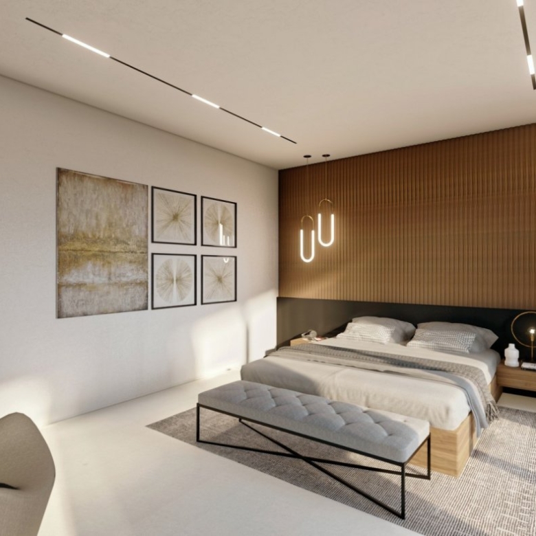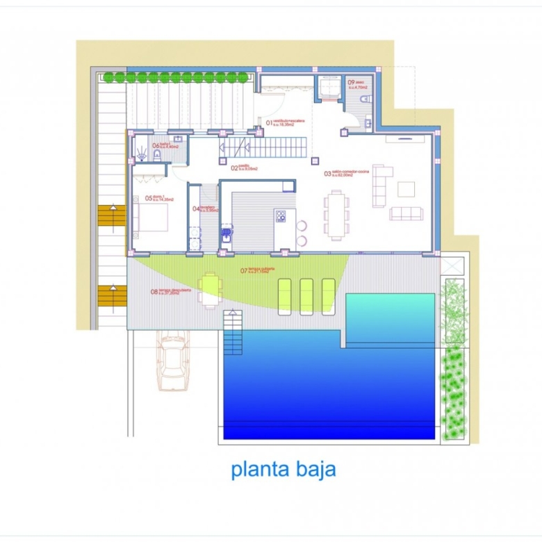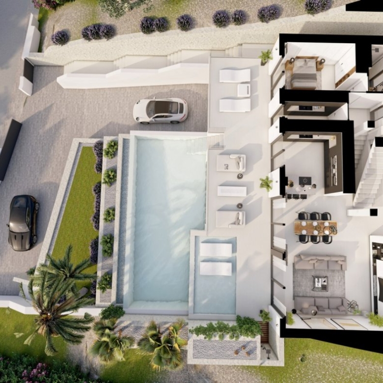 Op de begane grond vindt u een grote woonkamer met zit- en eetgedeelte, met een grote slaapkamer met eigen badkamer, een open keuken, terras aan de achterzijde van het pand en een groot pooldeck aan de voorzijde met infinity pool.