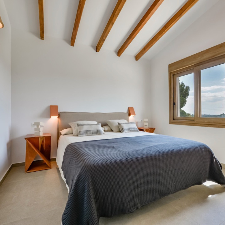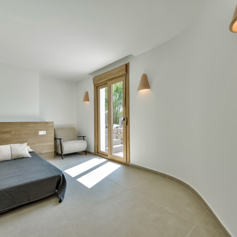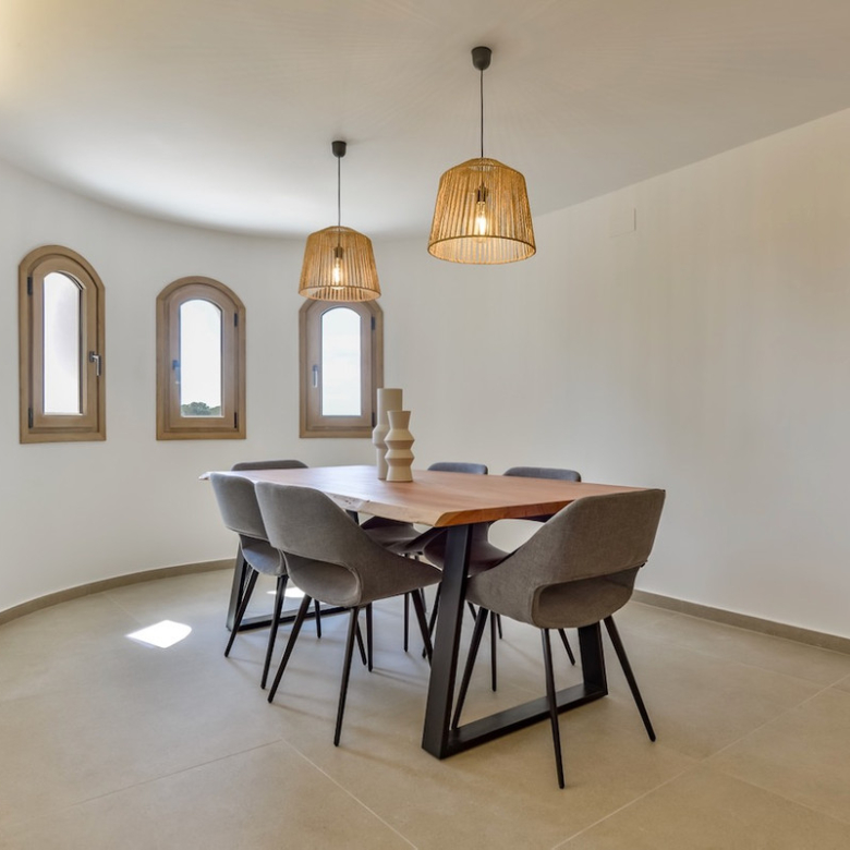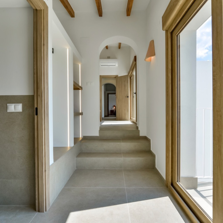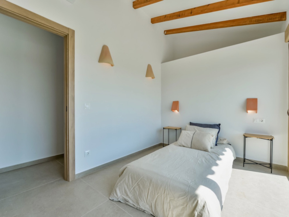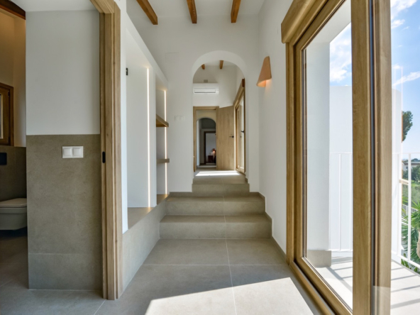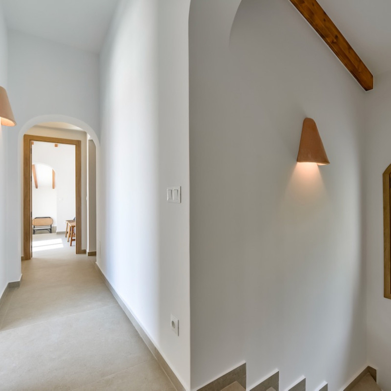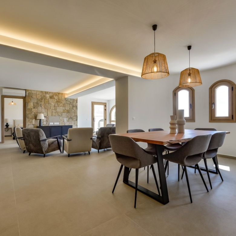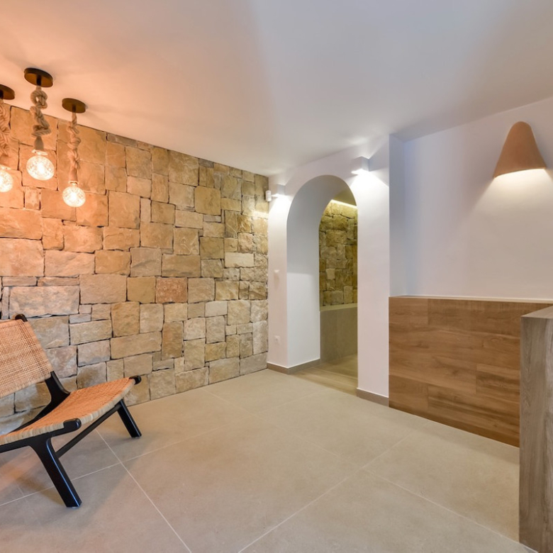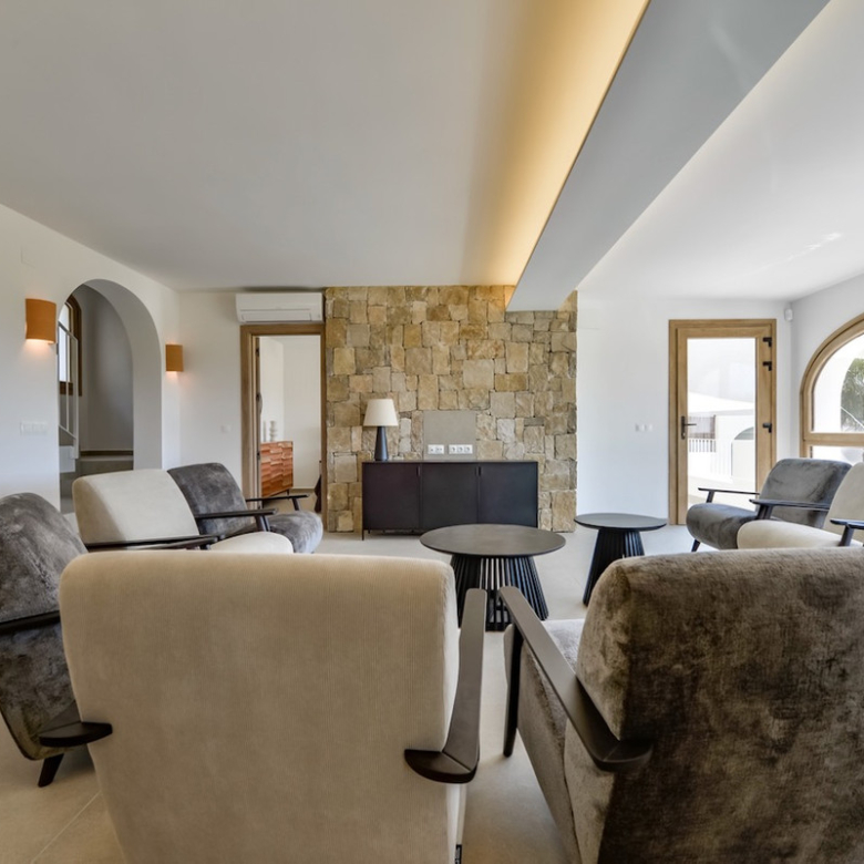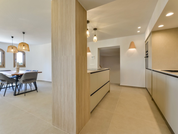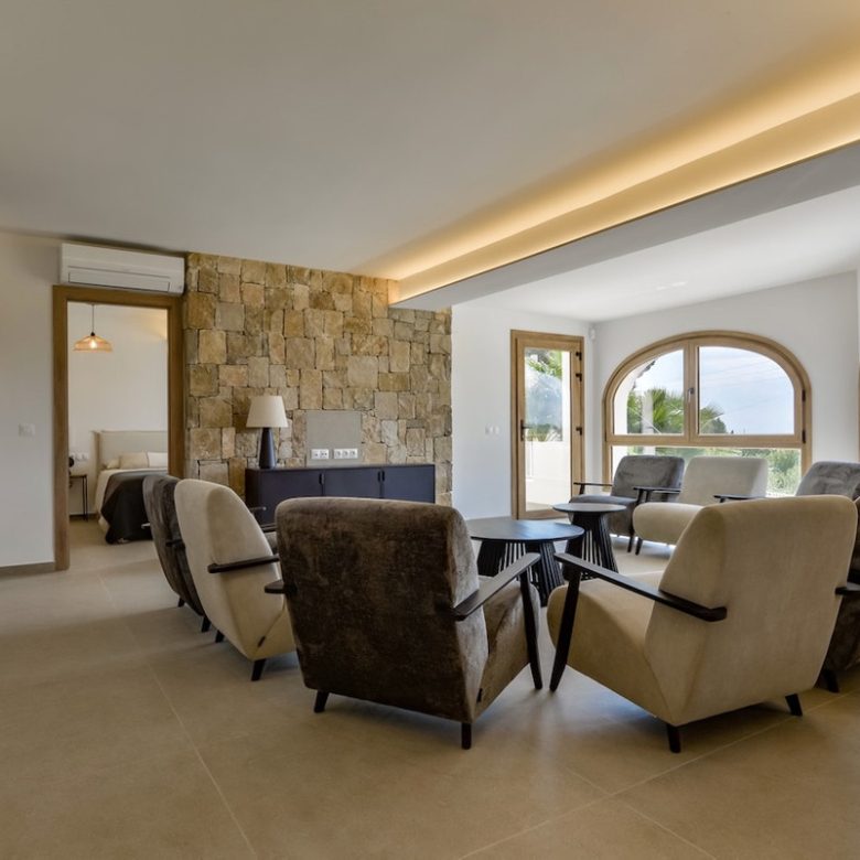 Binnen vindt u een lichte, open woonruimte met grote houten ramen en natuurstenen details die zorgen voor een warme, prettige sfeer. De keuken is volledig uitgerust met hoogwaardige apparatuur en Arklam werkbladen. Elke slaapkamer heeft toegang tot een eigen terras. Daarnaast is er een aparte wijnkelder, een speelkamer en diverse zitplekken buiten.