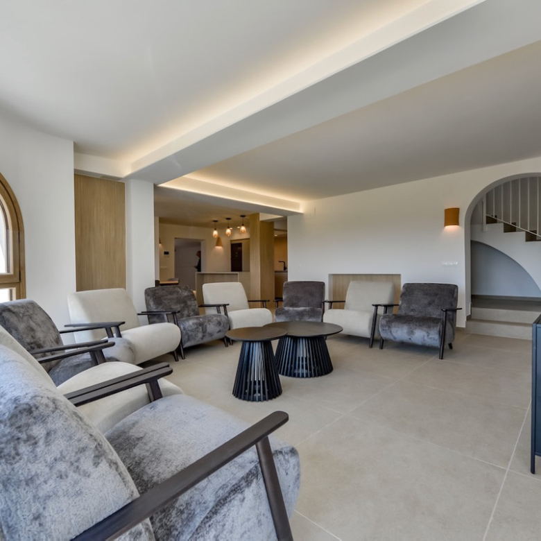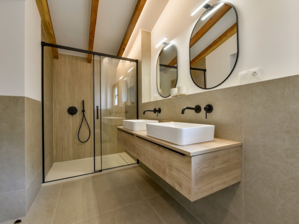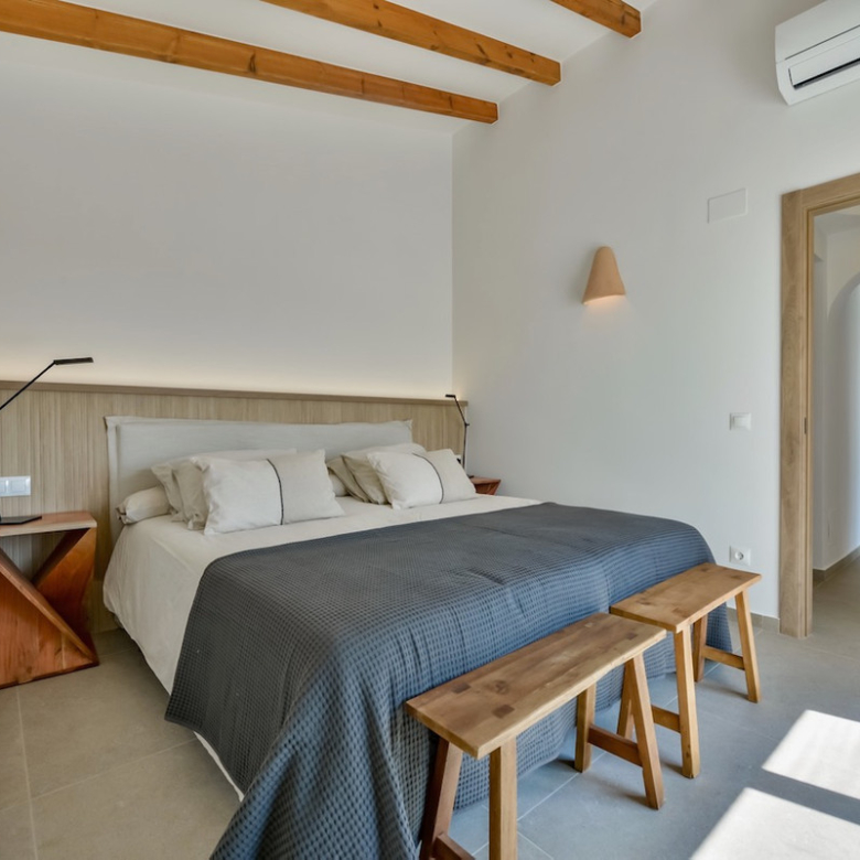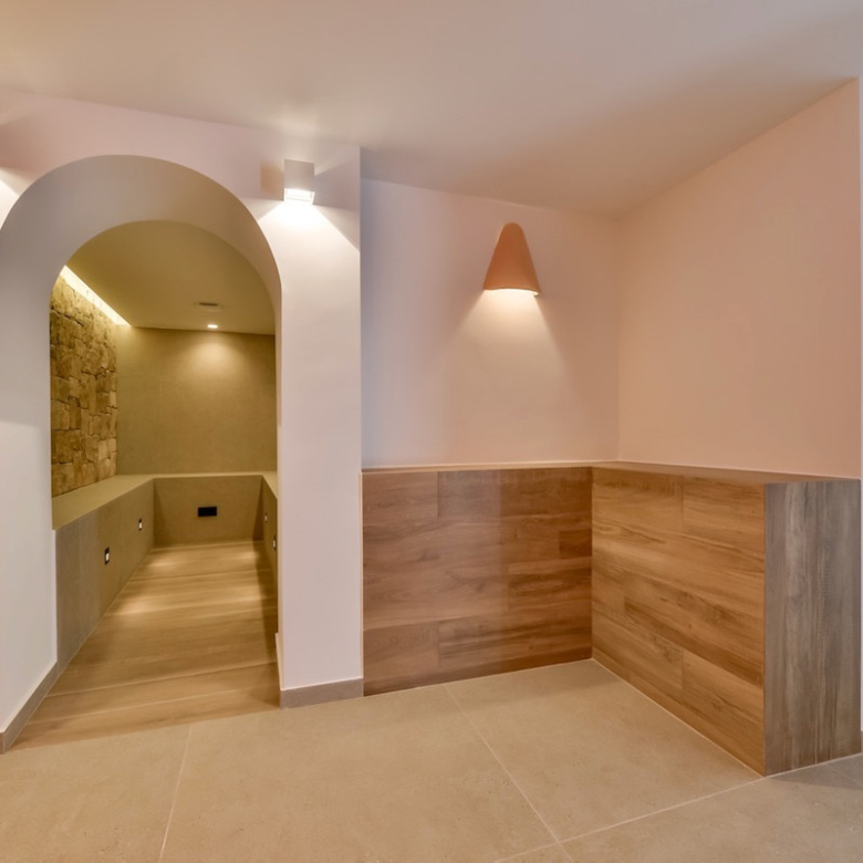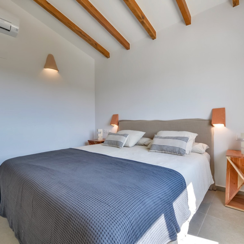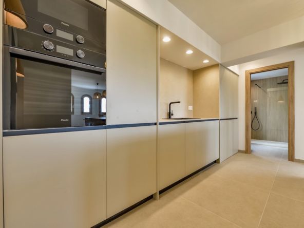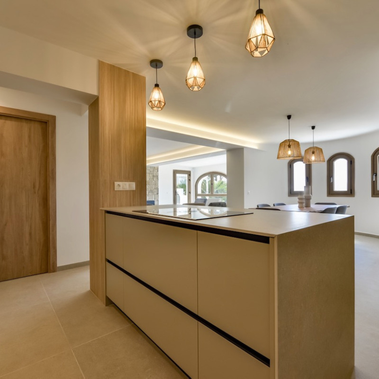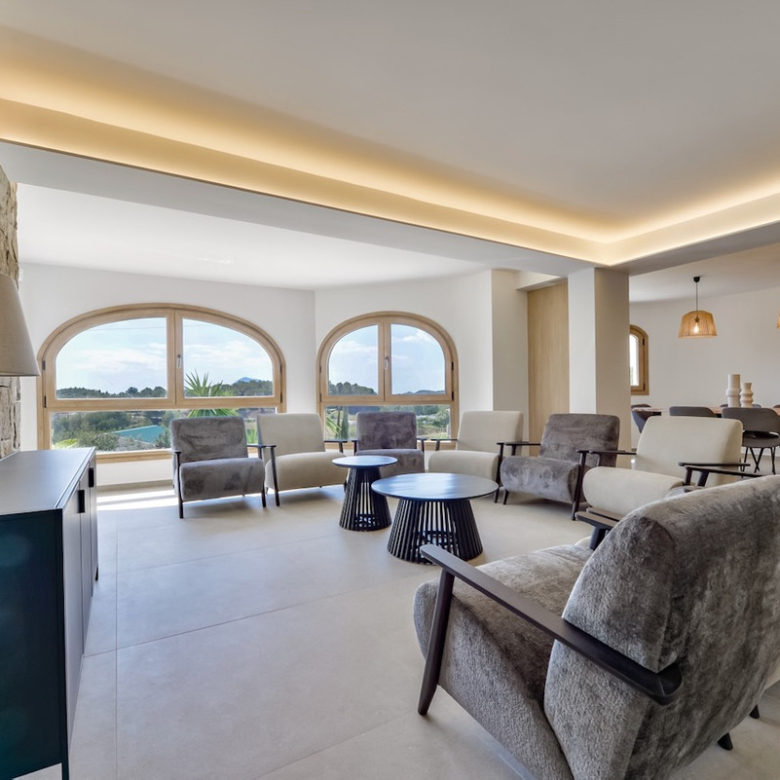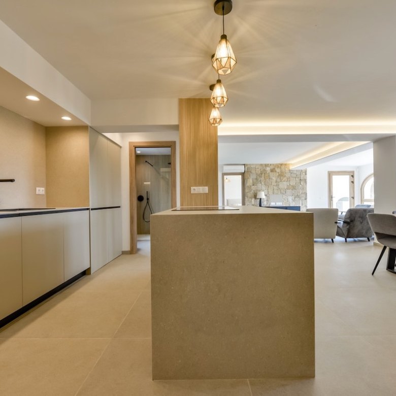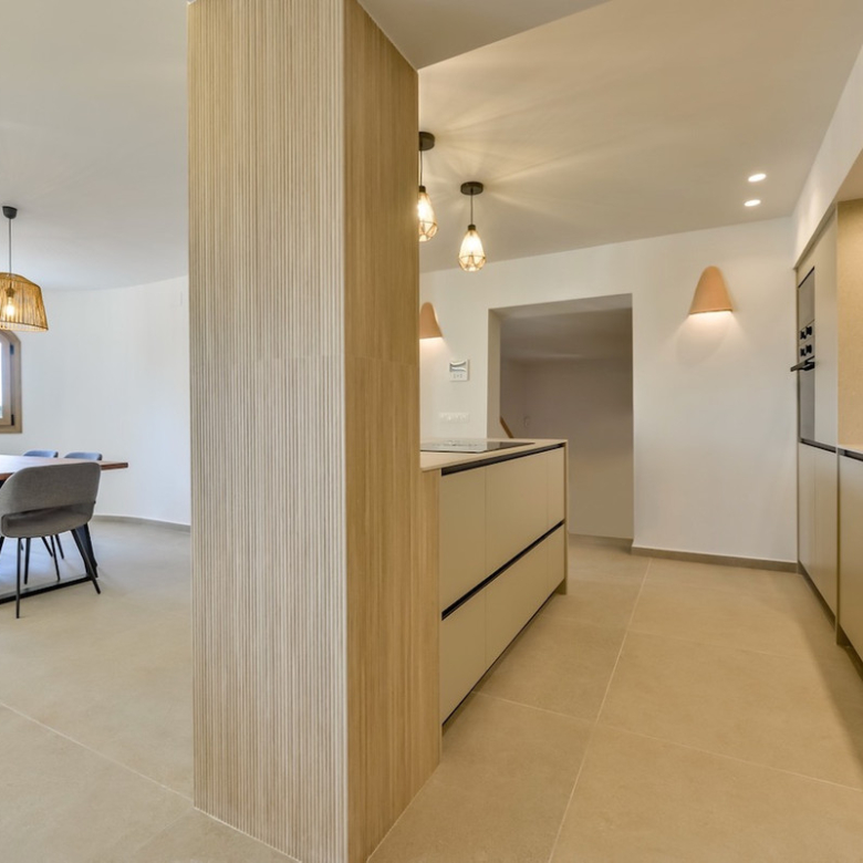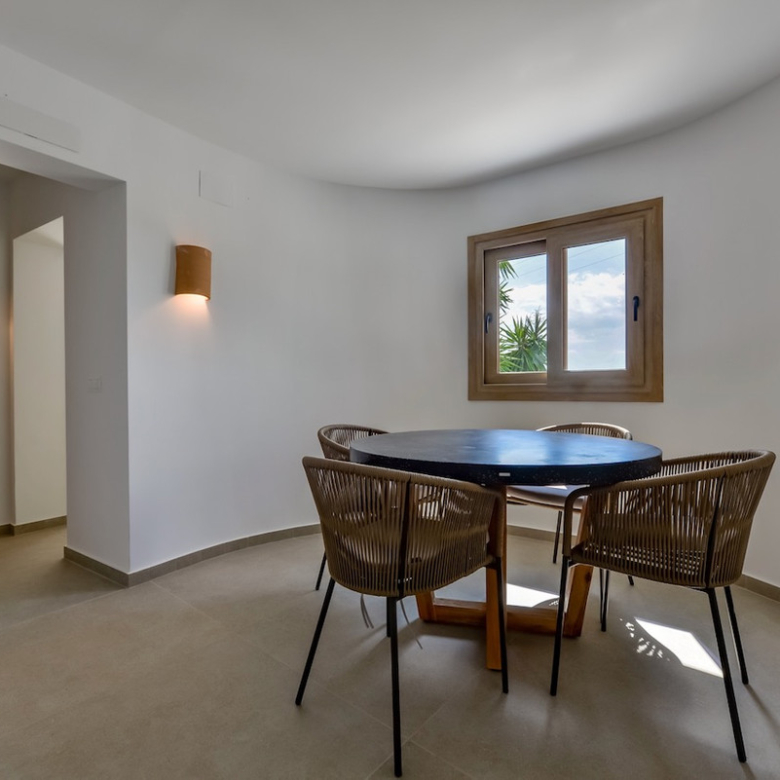 Binnen vindt u een lichte, open woonruimte met grote houten ramen en natuurstenen details die zorgen voor een warme, prettige sfeer. De keuken is volledig uitgerust met hoogwaardige apparatuur en Arklam werkbladen. Elke slaapkamer heeft toegang tot een eigen terras. Daarnaast is er een aparte wijnkelder, een speelkamer en diverse zitplekken buiten.