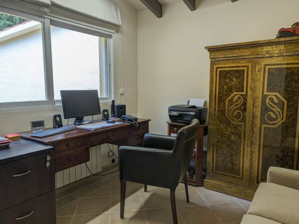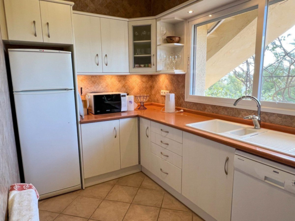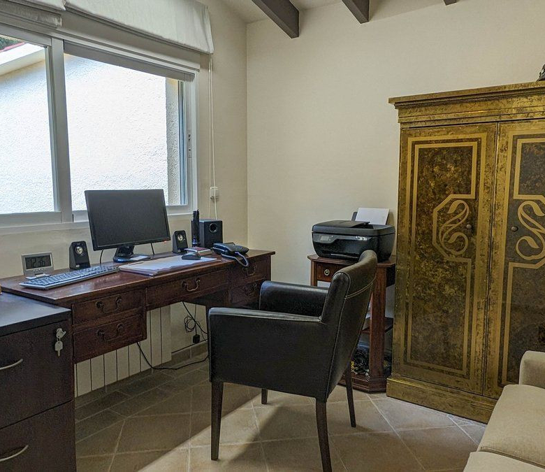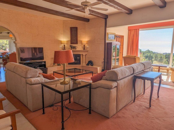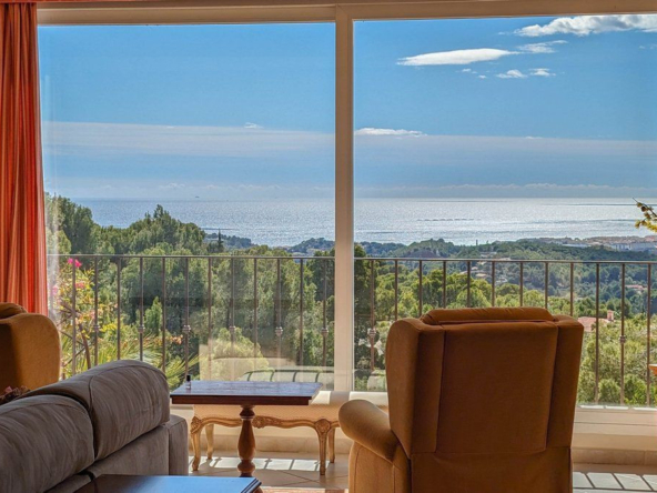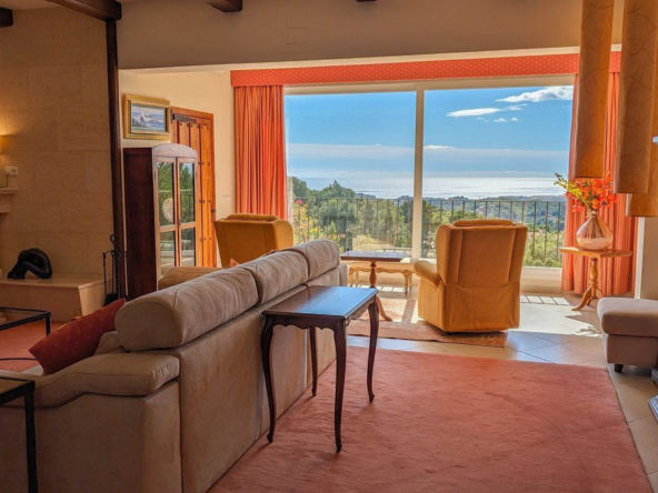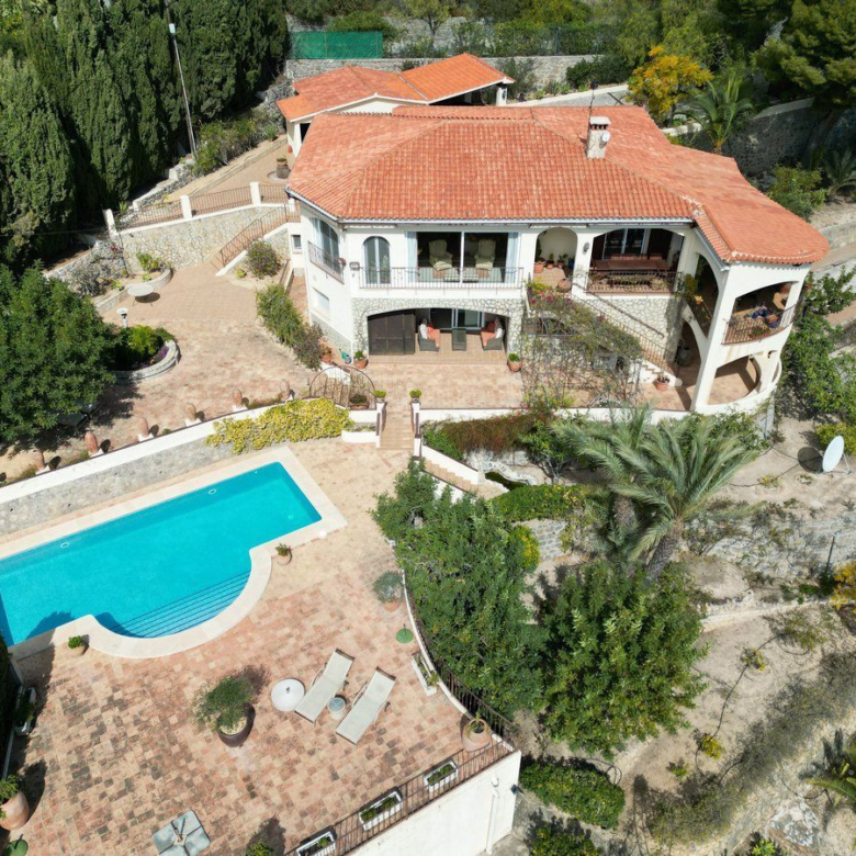 The property welcomes you in the entrance hall, leading to an inviting light and bright dining room and a spacious comfortable living room with a log burner, both the lounge and diner with beautiful peaceful green views which link on to a mesmerising seaview. There is a beautiful well-equipped kitchen with a large separate laundry area and guest wc.. Ths ideal property features 3 bedrooms( the smaller one at present used as an office), each with its own en-suite bathroom, . The terraces, both covered and open-air, offer panoramic views of the captivating Mediterranean Sea, the villas beautiful gardens and its attractive pool area.