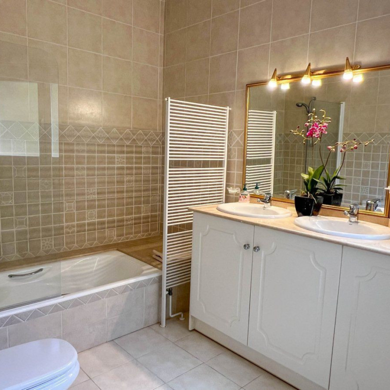 The lower floor houses a generous guest apartment, complete with a living-dining room, independent kitchen, 2 bedrooms with en-suite bathrooms, and a covered terrace for moments of relaxation.