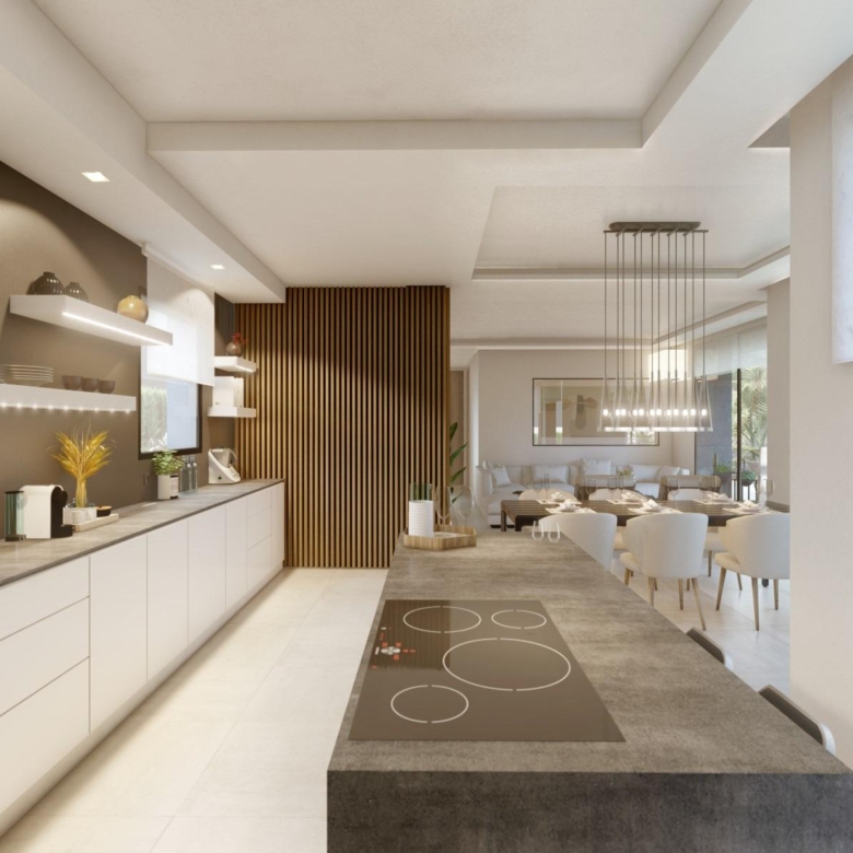 Luxe villa verdeeld over 3 verdiepingen en heeft 4 slaapkamers, 5 badkamers, ingerichte open keuken, woonkamer met grote ramen en directe toegang tot het zwembad.
