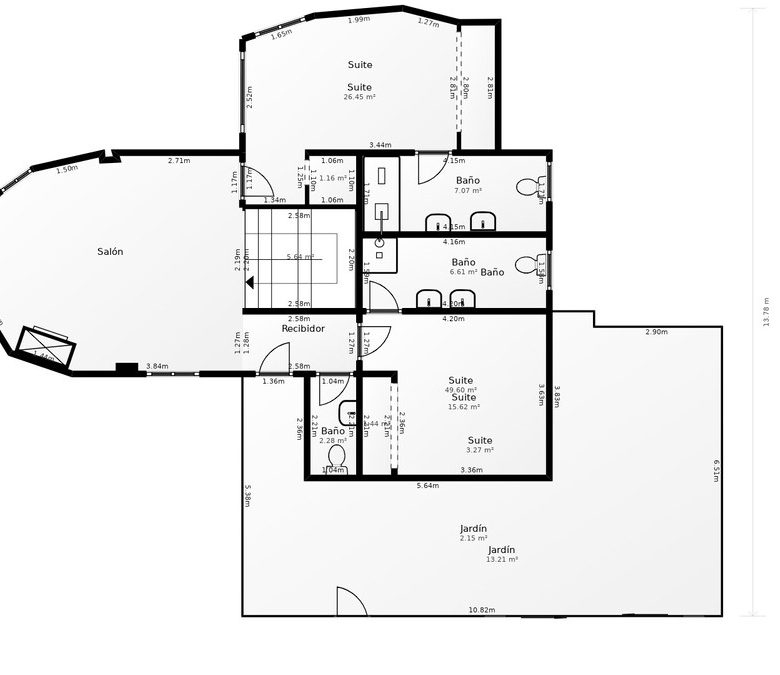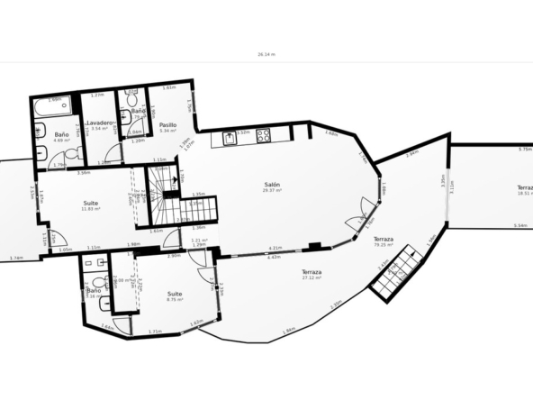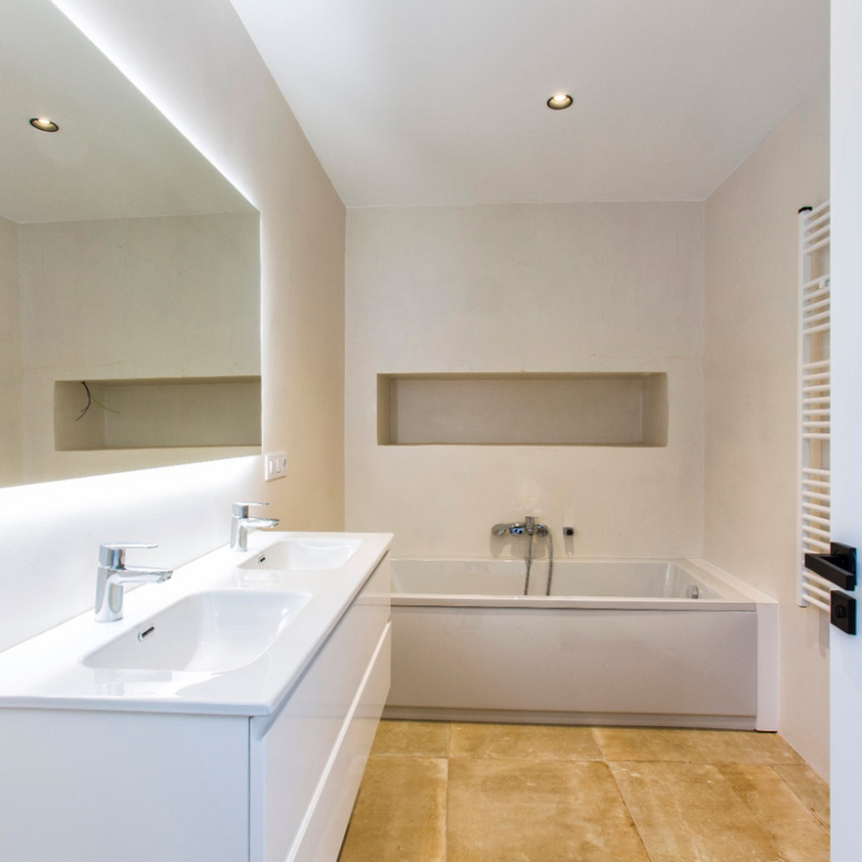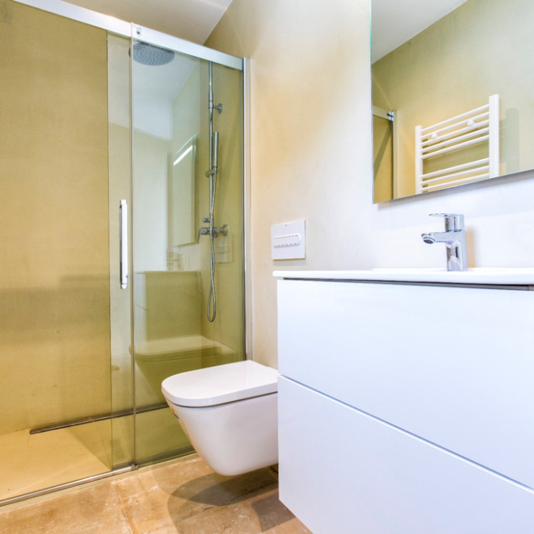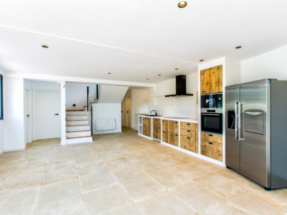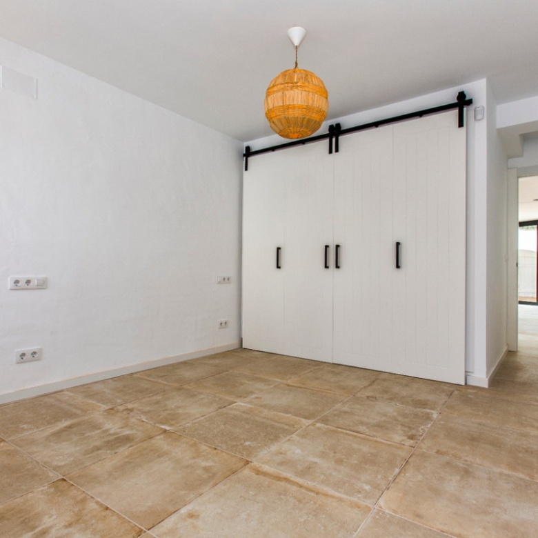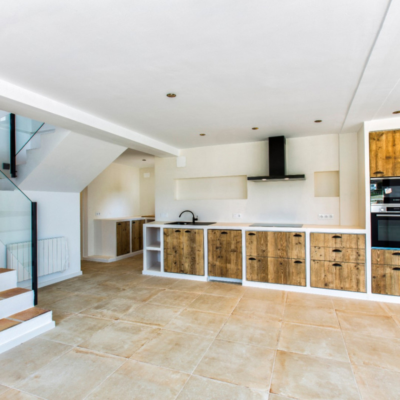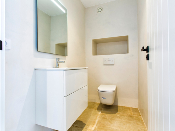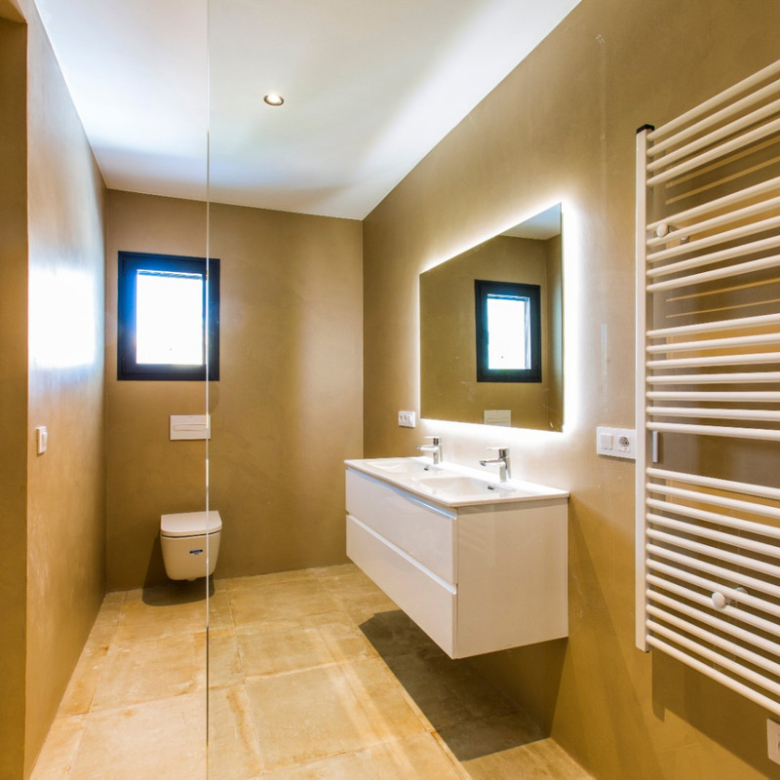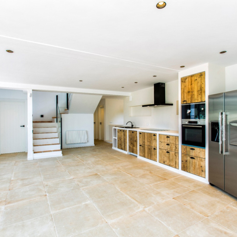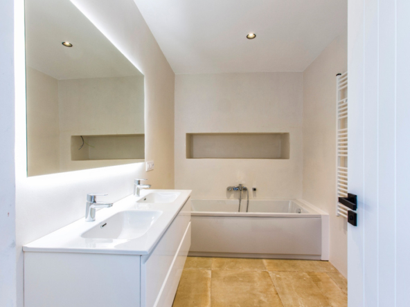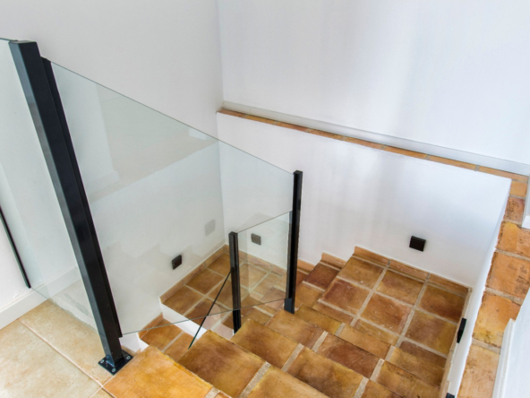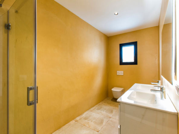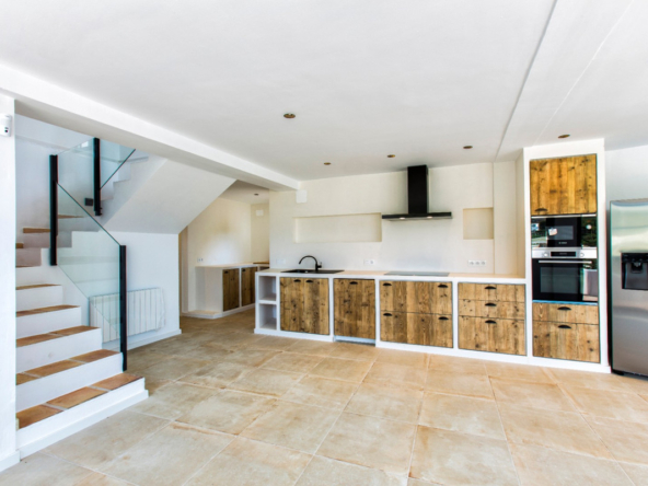 Een elegante interne trap leidt naar de benedenverdieping met een lichte ingerichte open keuken met bar (die zowel binnen als buiten kan worden gebruikt), directe toegang tot het terras en nog twee slaapkamers met stijlvolle inbouwkasten en en-suite badkamers. Een van hen biedt directe toegang tot het grote zonnige terras en de andere tot een privéterras aan de achterkant van het huis. Verder is er nog een gastentoilet en een wasruimte.