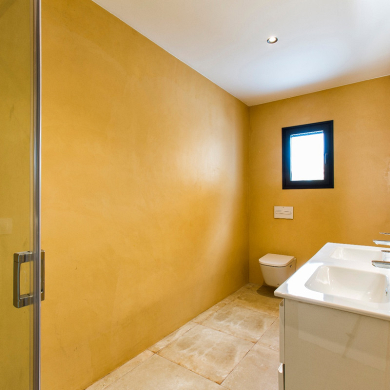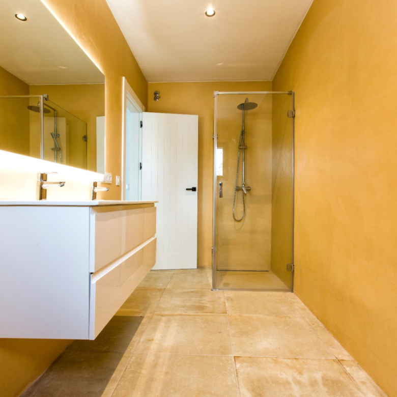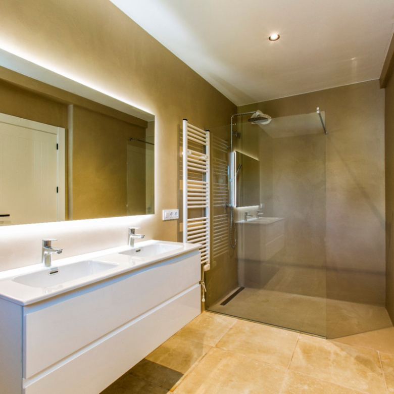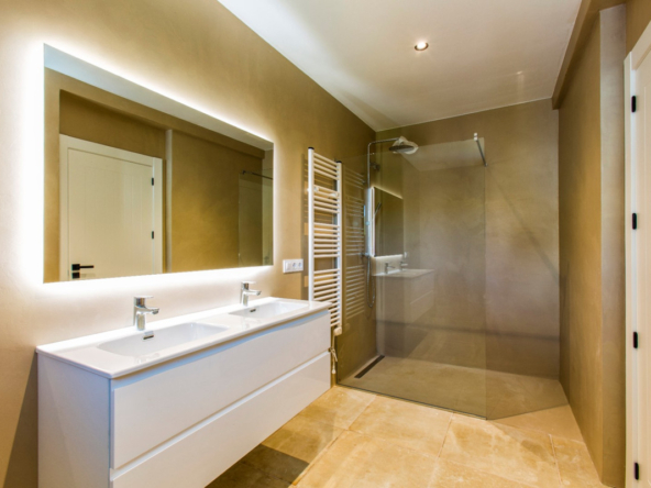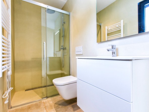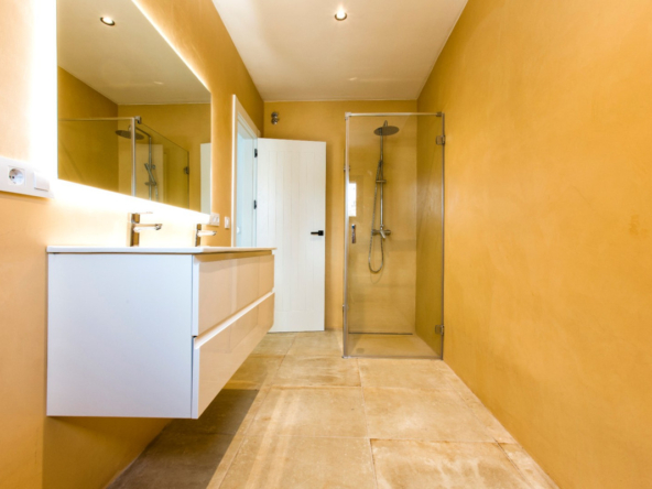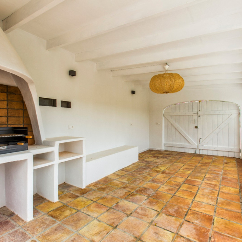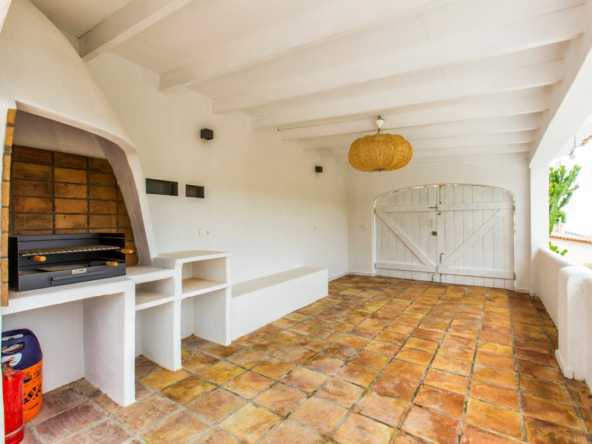 De buitenruimte omvat een overdekte zithoek met een ingebouwde barbecue en een praktische buitendouche bij het zwembad. De verschillende terrassen bieden voldoende ruimte voor ligstoelen, ideaal om te ontspannen in de mediterrane zon.