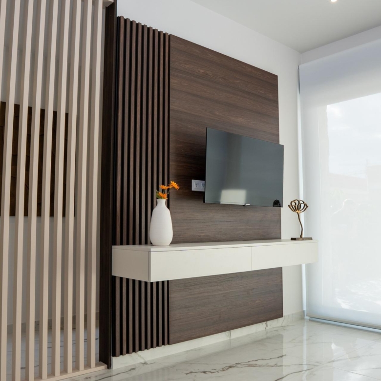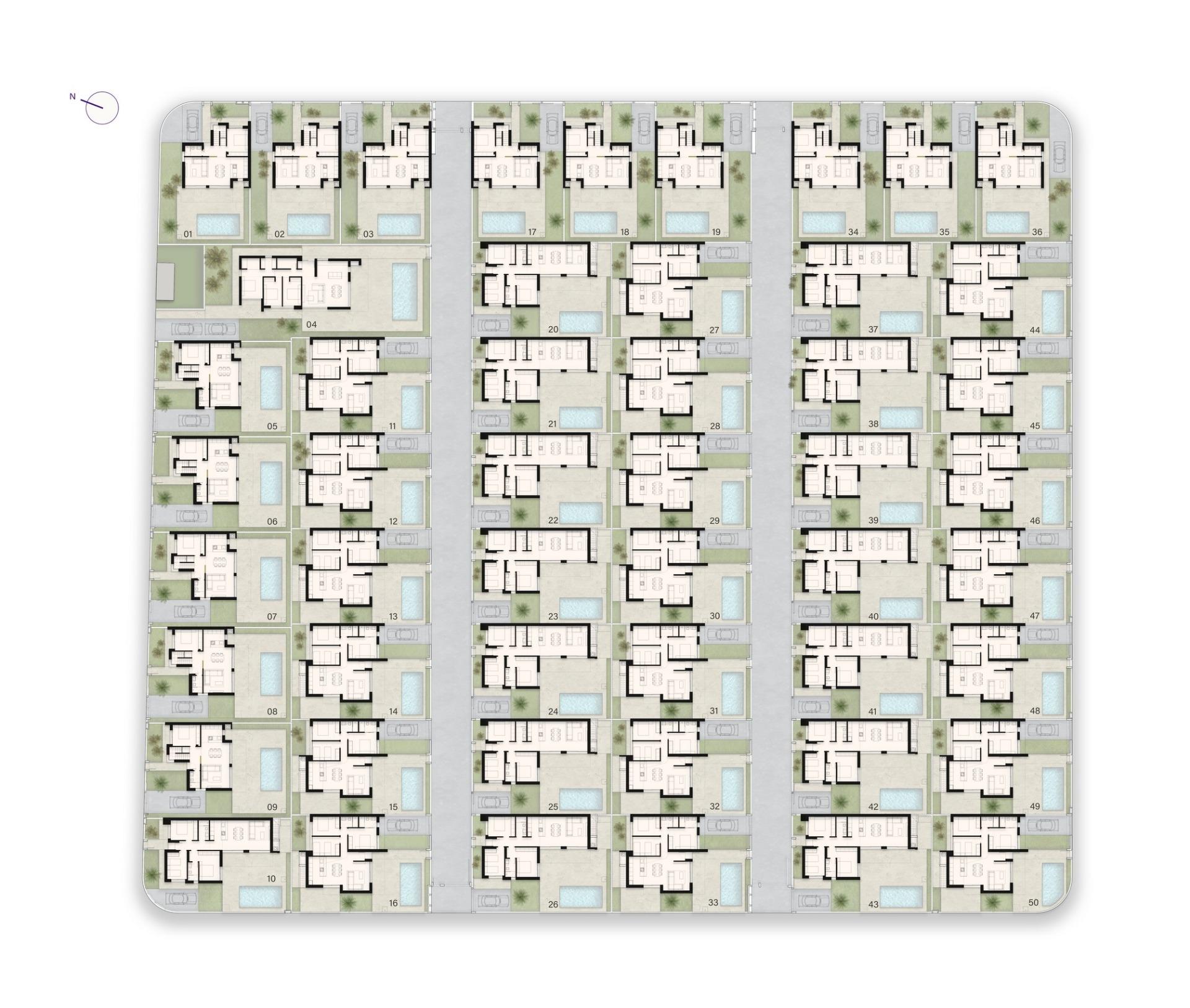 Villa’s: Onafhankelijke woningen met drie slaapkamers en 2/3 badkamers, beschikbaar met één of twee verdiepingen. Elke villa heeft een privézwembad, een solarium en parkeergelegenheid op het perceel. Optionele kelders zijn ook beschikbaar.