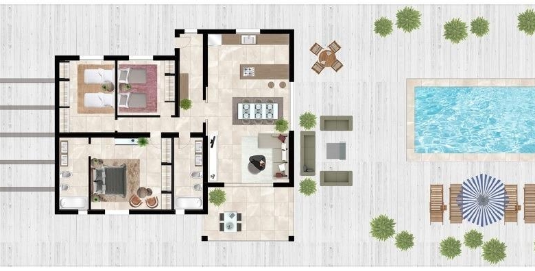 Moderne gelijkvloerse villa gebouwd op een enorm perceel van 10.000 m2, heeft 3 slaapkamers, 2 badkamers, gastentoilet, open ingerichte keuken met ruime woon-eetkamer, grote ramen van vloer tot plafond met veel natuurlijk licht, ingebouwde kasten.