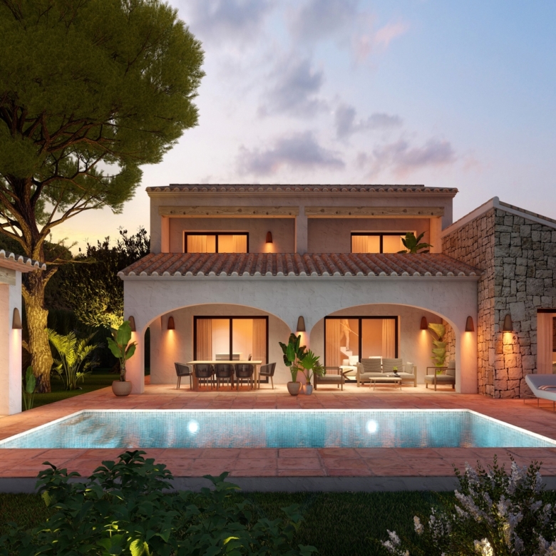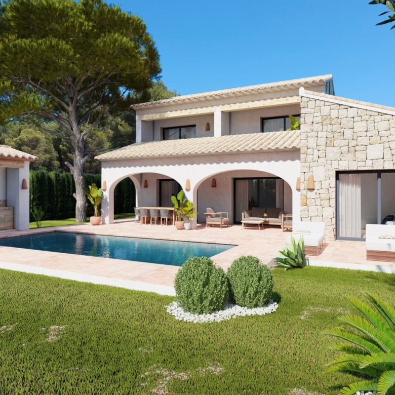 Nieuwbouw villa te koop in Javea in de La Cala urbanisatie. De ligging in het dennenbos aan de weg die naar de vuurtoren van Cao de la Nao leidt, past perfect bij de warme, knusse en landelijke uitstraling van dit project. Urbanisatie La Cala heeft riolering, straatverlichting, waterleidingnet, ondergrondse elektrische bedrading en ondergronds telefoonnet als ook centrale gasvoorziening.