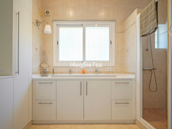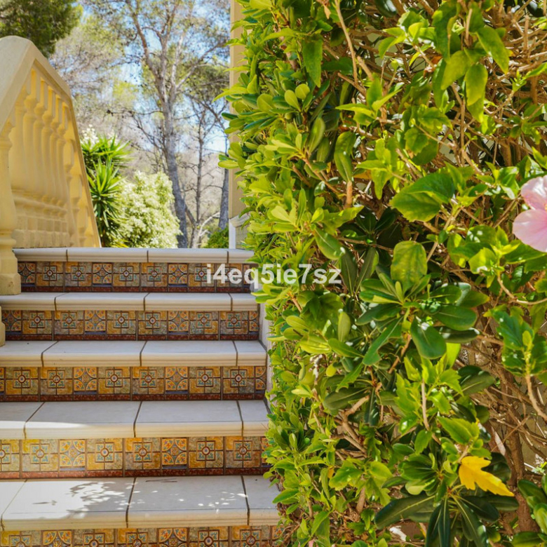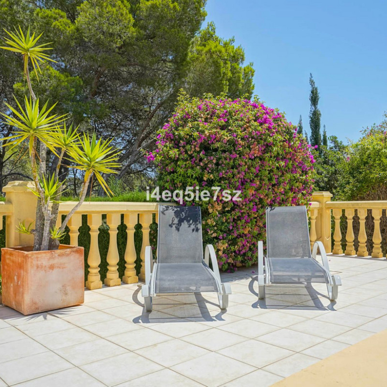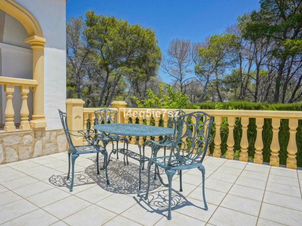 Het terras kijkt uit op een aanzienlijk privé verwarmd zwembad, ideaal voor de wintermaanden, omringd door volwassen mediterrane beplanting die een rustige en privé sfeer biedt. Dankzij de zuidgerichte ligging geniet het pand de hele dag door van zonneschijn en overvloedig natuurlijk licht binnen.