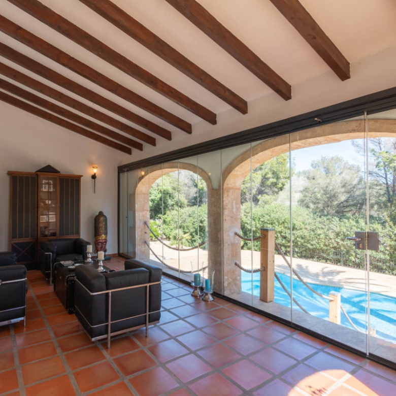 Een ruime ruimte combineert een lichte eetkamer met een comfortabele woonkamer, die aansluit op een grote glazen terras met kristallen gordijnen, wat een perfecte binnen-buiten leefervaring het hele jaar door creëert. De ruime keuken, volledig uitgerust, biedt veel opbergruimte en aanrechtbladen, ideaal voor familiediners of voor het ontvangen van gasten.