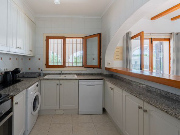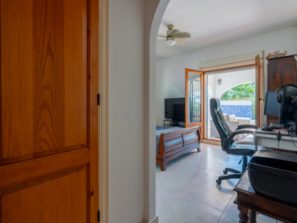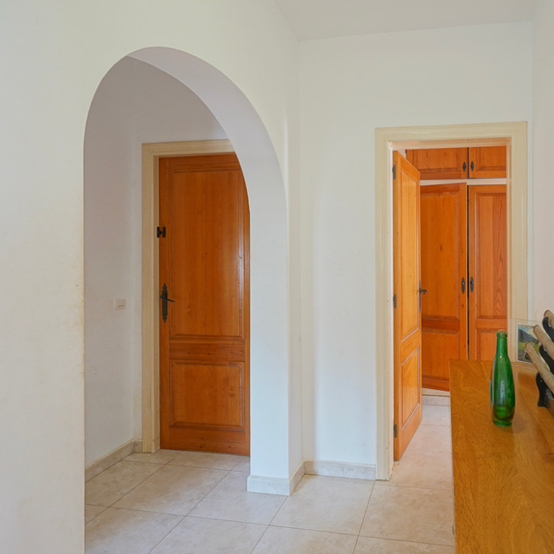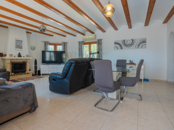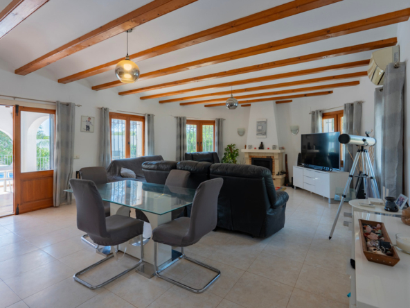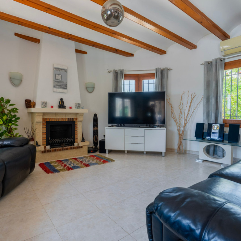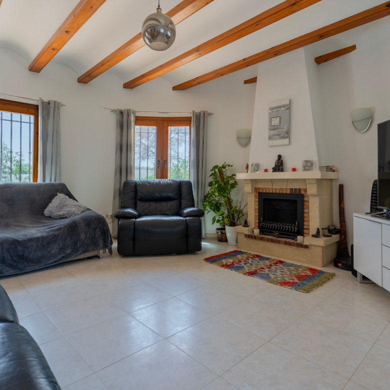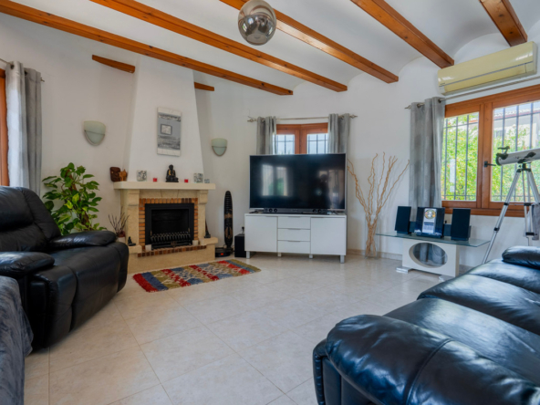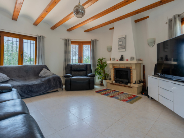 De woning is volledig gelijkvloers en beschikt over een gezellige woon-eetkamer met open haard en een aangrenzende halfopen keuken. Er zijn in totaal drie tweepersoonsslaapkamers, waarvan één met en-suite badkamer, plus een aparte badkamer. Vanuit zowel de woonkamer als de hoofdslaapkamer is er directe toegang tot een ruim overdekt terras aan het zwembad, de perfecte plek om te ontspannen en te genieten van het mediterrane klimaat. Enkele treden lager ligt een zonnig onoverdekt terras met barbecue. De villa beschikt daarnaast over een mediterrane tuin van laag onderhoud met palmbomen, bloemenstruiken en een granaatappelboom.