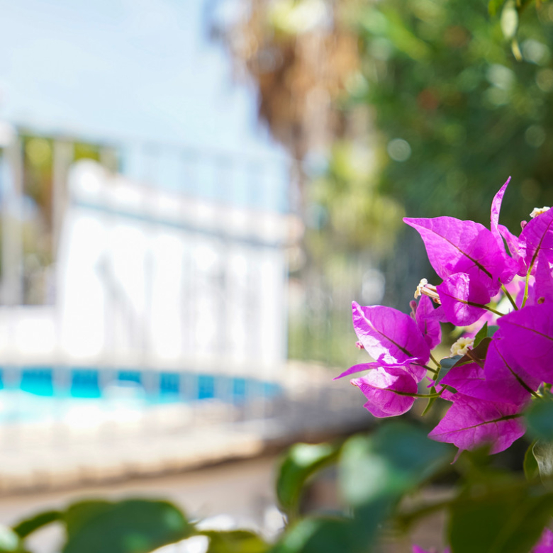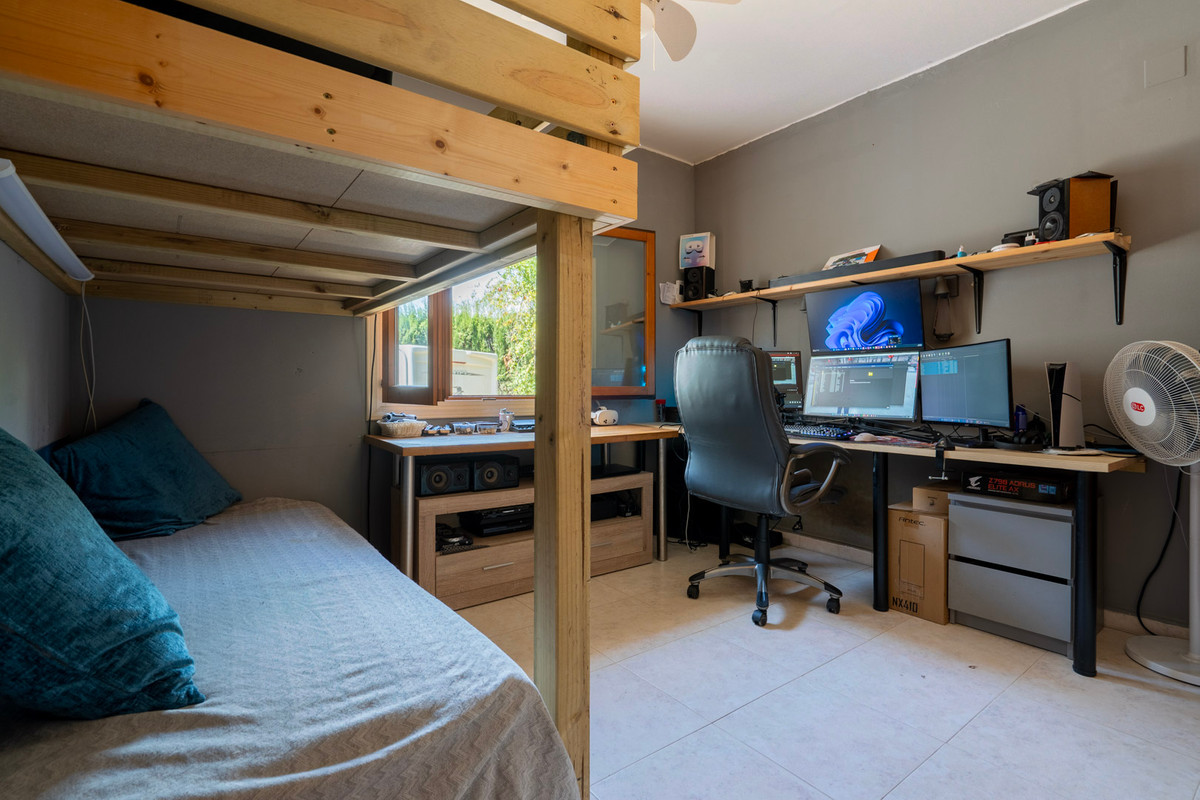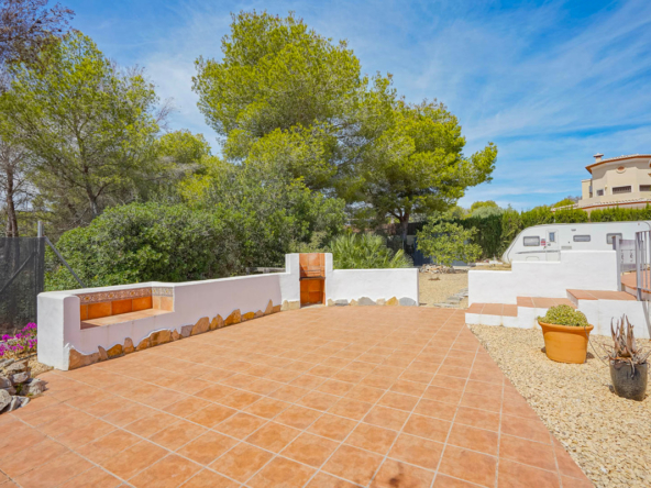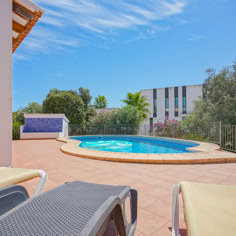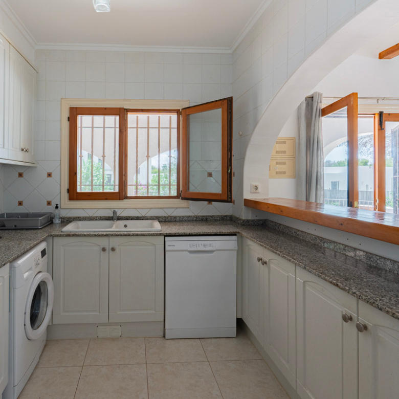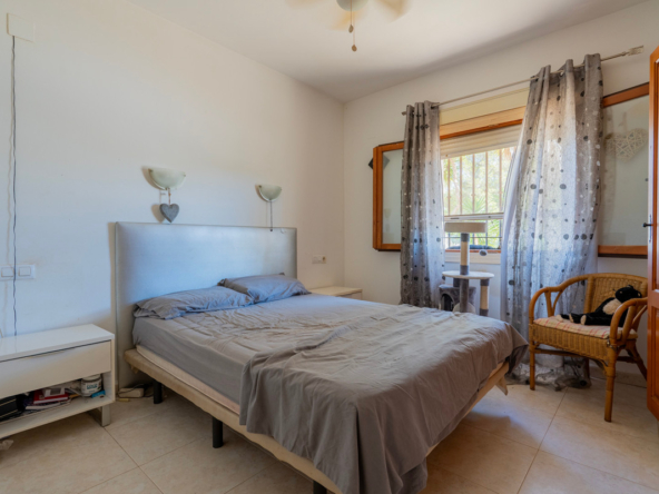De woning is volledig gelijkvloers en beschikt over een gezellige woon-eetkamer met open haard en een aangrenzende halfopen keuken. Er zijn in totaal drie tweepersoonsslaapkamers, waarvan één met en-suite badkamer, plus een aparte badkamer. Vanuit zowel de woonkamer als de hoofdslaapkamer is er directe toegang tot een ruim overdekt terras aan het zwembad, de perfecte plek om te ontspannen en te genieten van het mediterrane klimaat. Enkele treden lager ligt een zonnig onoverdekt terras met barbecue. De villa beschikt daarnaast over een mediterrane tuin van laag onderhoud met palmbomen, bloemenstruiken en een granaatappelboom.