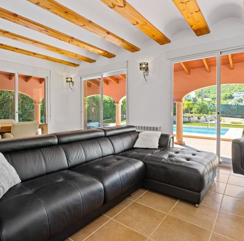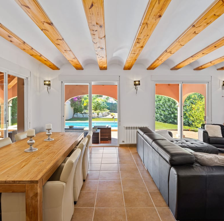 De lichte woonkamer is ruim opgezet met een gezellige zithoek rond de open haard en schuifdeuren die direct toegang geven tot de naya, waardoor een naadloze overgang tussen binnen en buiten ontstaat. Authentieke details, zoals de Spaanse plafonds met houten balken, geven warmte en karakter.