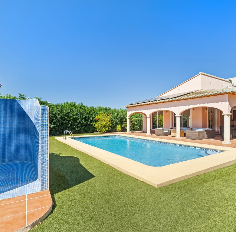 Gelegen op een vlak perceel in een rustige omgeving van Jávea, biedt deze charmante villa met vier slaapkamers en drie badkamers (gebouwd in 2008) een royaal gelijkvloers wooncomfort en een uitnodigende mediterrane levensstijl. De brede entree en gelijkvloerse indeling zorgen voor optimaal gemak, waarbij de huidige toegang slechts twee lage treden heeft die eenvoudig geschikt gemaakt kunnen worden voor rolstoeltoegang.