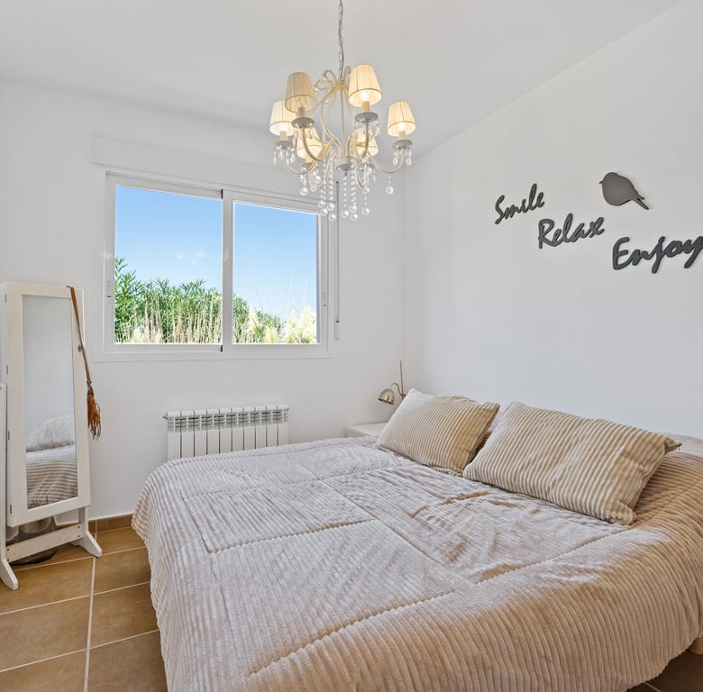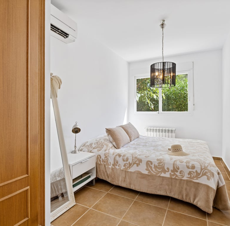 De woning beschikt over vier comfortabele slaapkamers, allemaal met inbouwkasten en klimaatbeheersing via split airconditioning en centrale verwarming op gas. De ramen zijn voorzien van dubbel glas en rolluiken. Drie nette badkamers (waarvan één en-suite) zijn uitgerust met bad en douche, wastafel, toilet en bidet.