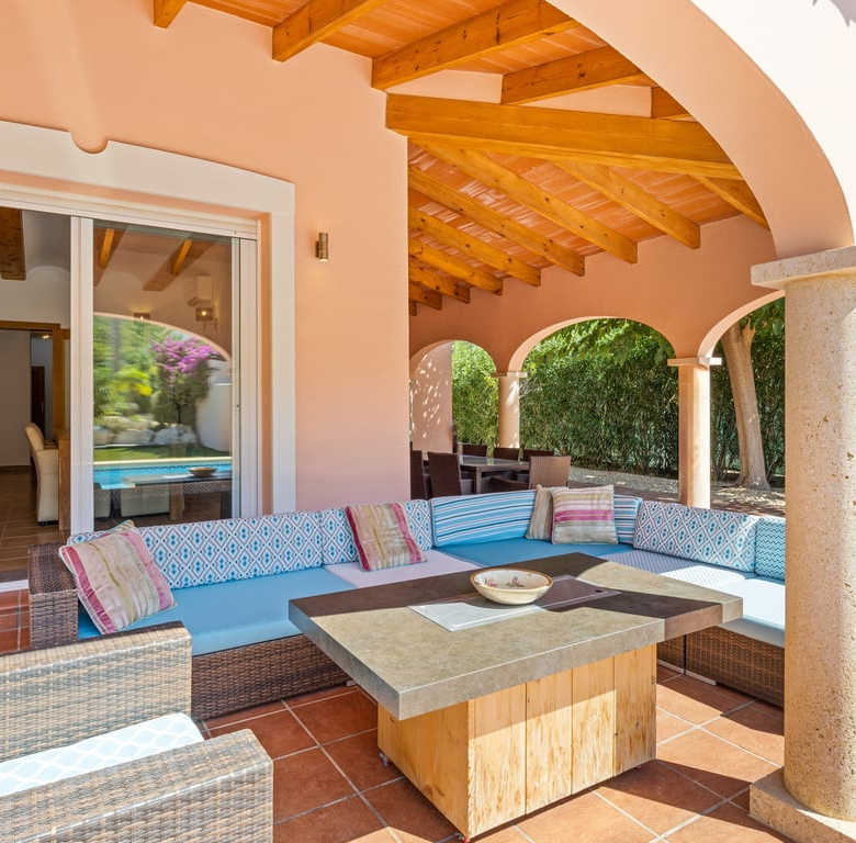 De ruime naya met groot terras biedt voldoende plek voor een lange eettafel en een comfortabele loungehoek – ideaal voor lange zomeravonden met uitzicht op het mozaïekzwembad en het berglandschap.