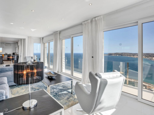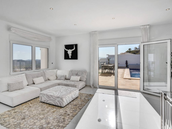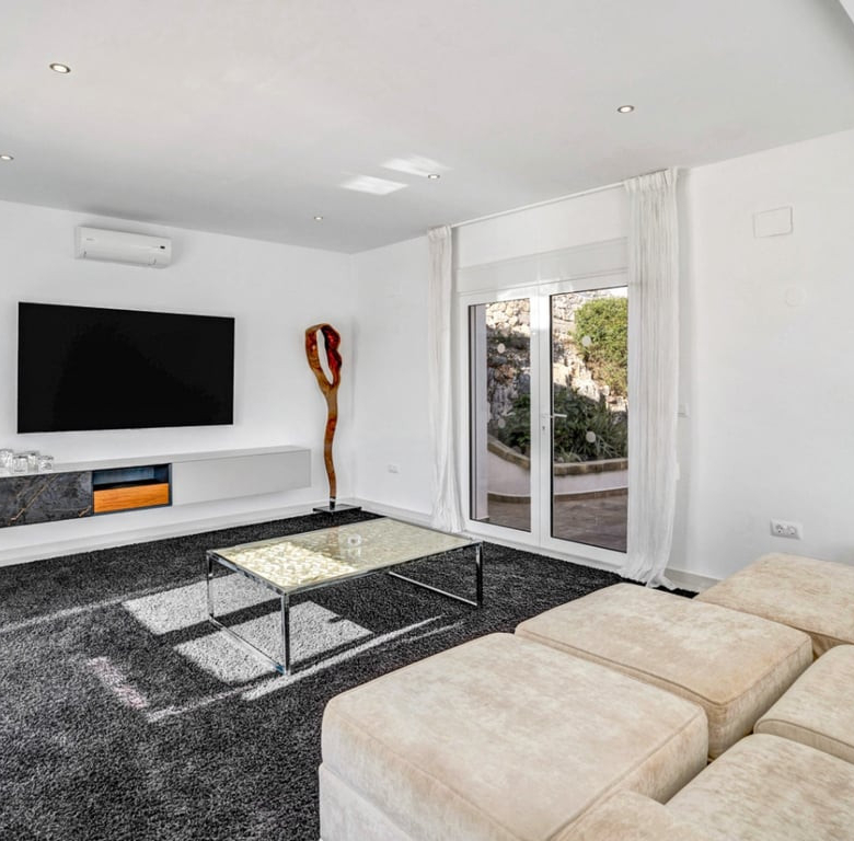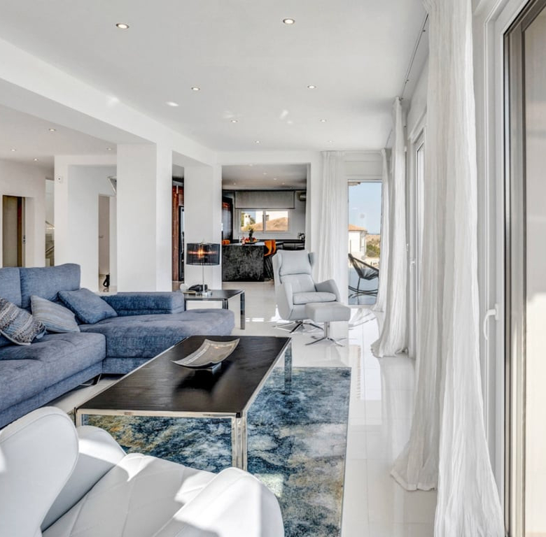 De woonkamer biedt verschillende zithoeken, zoals een televisiehoek, een chill-out plek en een prachtige zithoek met panoramisch uitzicht op zee. Vanuit de woonkamer is er directe toegang tot het grote terras met een privézwembad en een buitendouche en toilet.