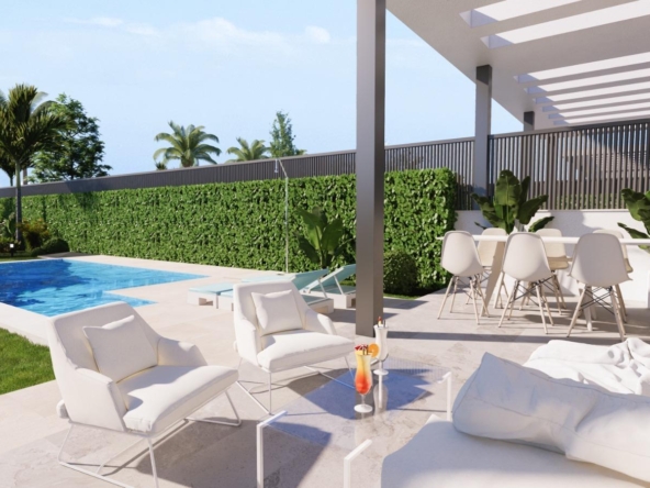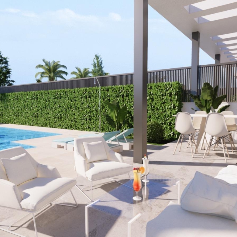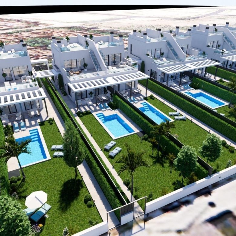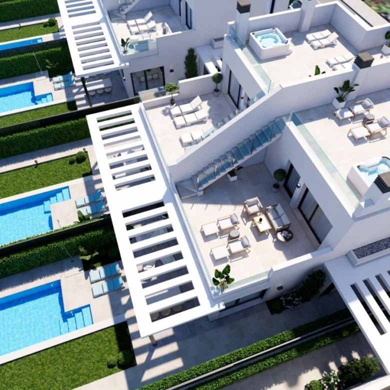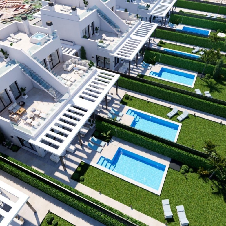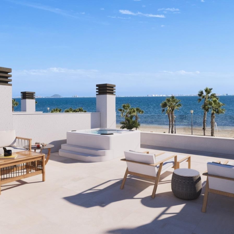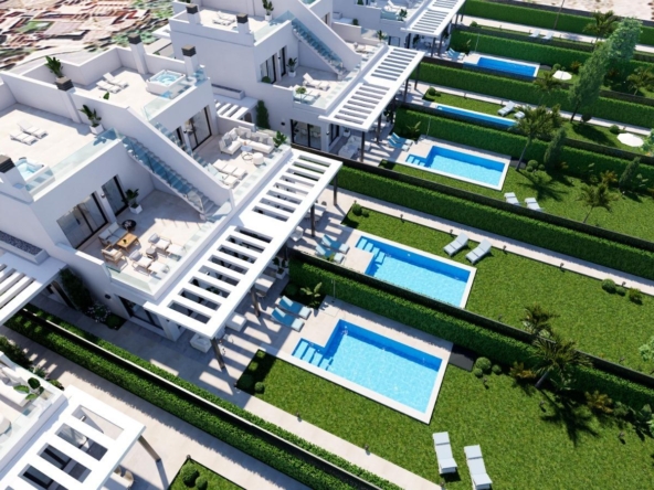 Privézwembad en solarium: Elke villa heeft een zoutwater privézwembad en een solarium op het dak, uitgerust met een jacuzzi, sfeervolle LED-verlichting en een pre-installatie voor een buitenkeuken – ideaal voor entertainment terwijl u geniet van het uitzicht op de Mar Menor.