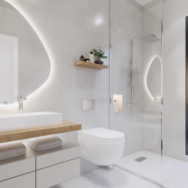 Stijlvolle badkamers: Hoogwaardige badkamers hebben hangende badmeubels, douchebakken van hars en ingebouwde doucheschermen.