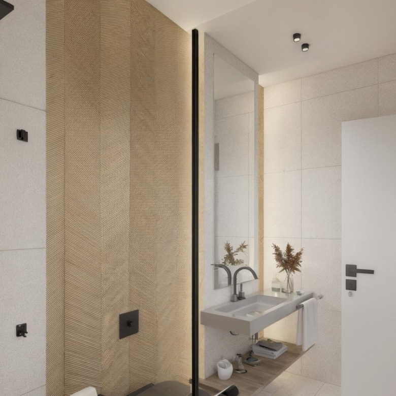Op de bovenverdieping zijn er twee ruime slaapkamers, elk met een eigen badkamer, waarvan één en suite. Beide slaapkamers hebben toegang tot een privé terras van 17 m². Voor wie nog meer buitenruimte wil, is er tegen meerprijs een optioneel solarium op het dak beschikbaar.