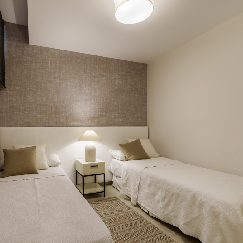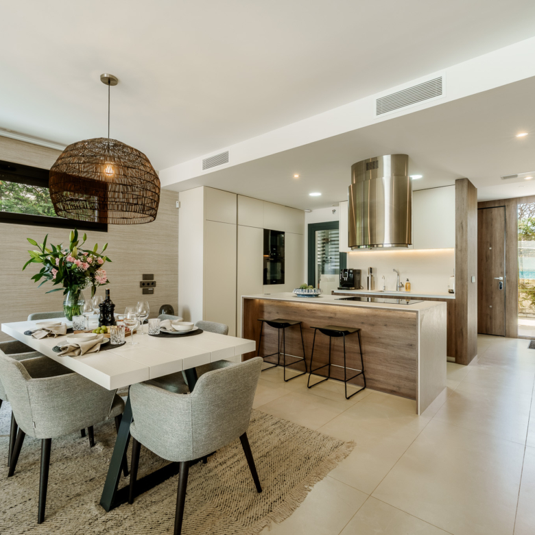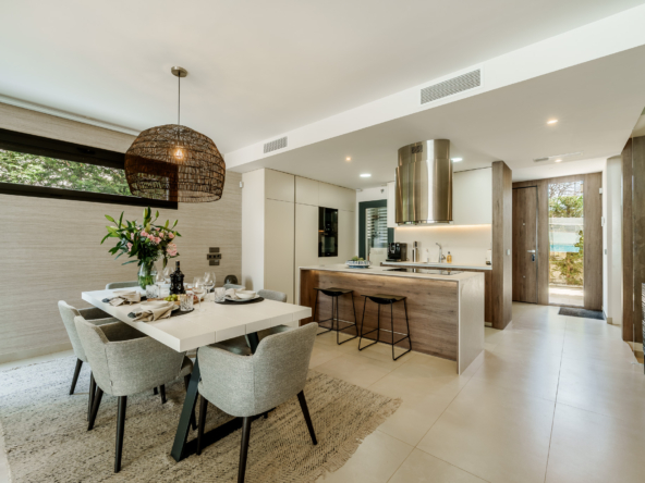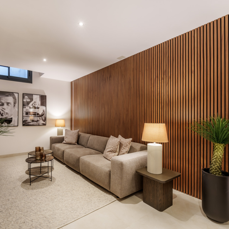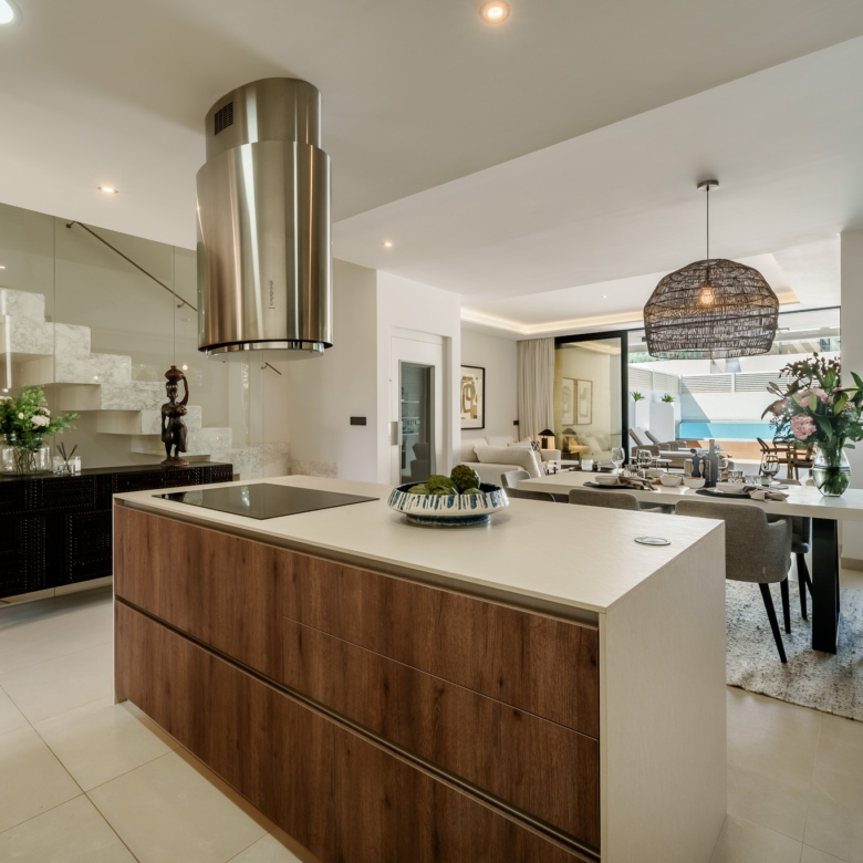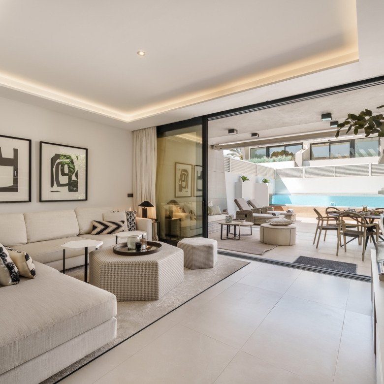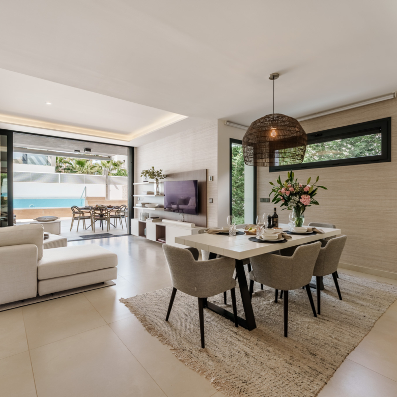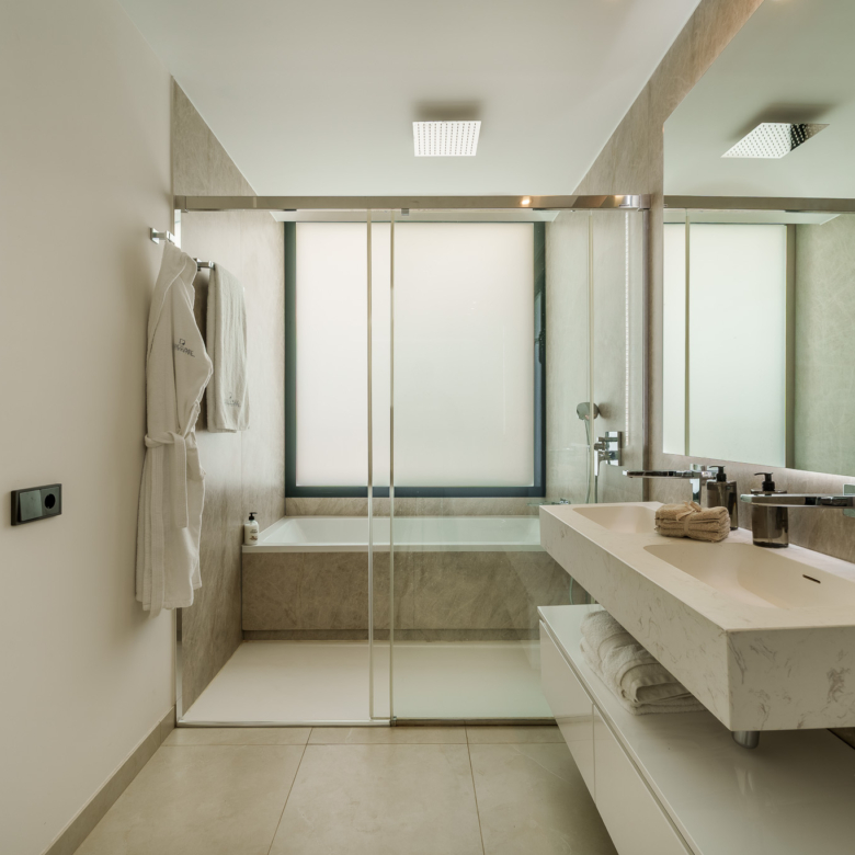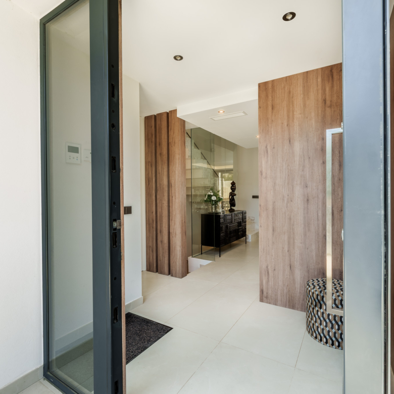 De buitenkant van de villa is een ware oase van rust. Het beschikt over een privézwembad, perfect om te genieten van het zonnige klimaat van Marbella. Het terras is een ideale ruimte om te ontspannen of gasten te vermaken, met een vrij uitzicht en een serene sfeer. Bovendien omvat het pand een solarium, dat een extra plek biedt om in volledige privacy van de zon te genieten. Het ontwerp van de tuin vult de moderne esthetiek van de villa aan, waardoor een harmonieuze en gastvrije omgeving ontstaat.