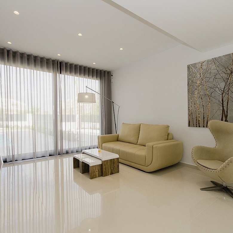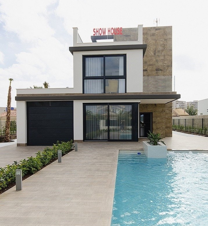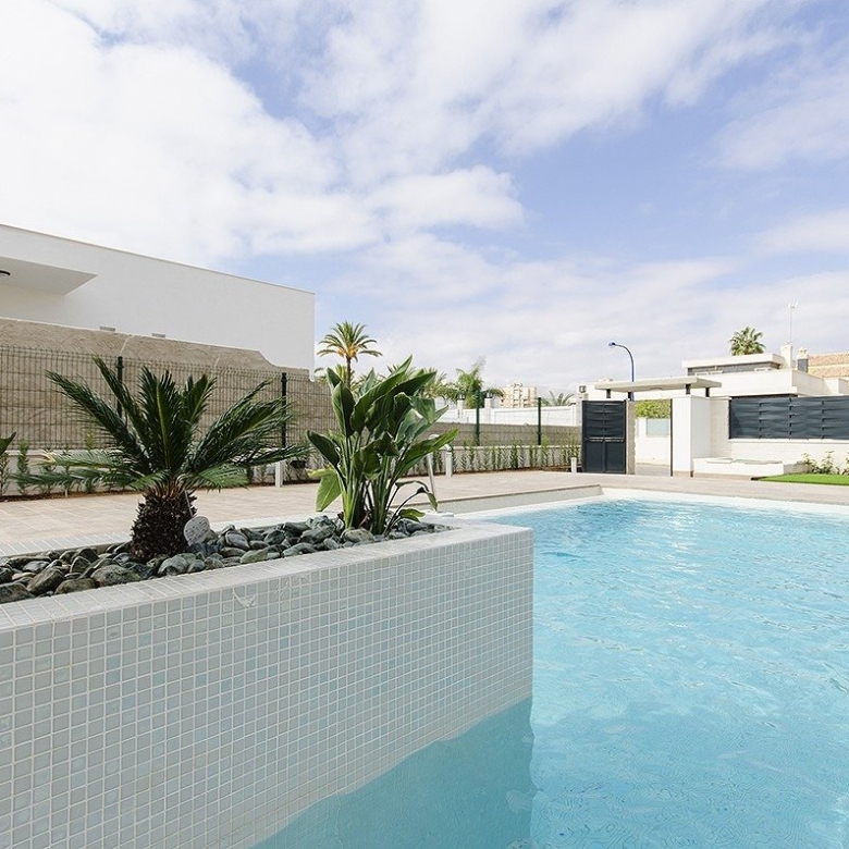 De actie omvat verschillende modellen van woningen met 2,3,4 en tot 5 slaapkamers. Deze bijzondere villa bestaat uit 4 slaapkamers, 2 badkamers, een volledig uitgeruste Amerikaanse keuken, een open woon-eetkamer met veel verlichting, toegang tot de tuin en het prachtige zwembad.