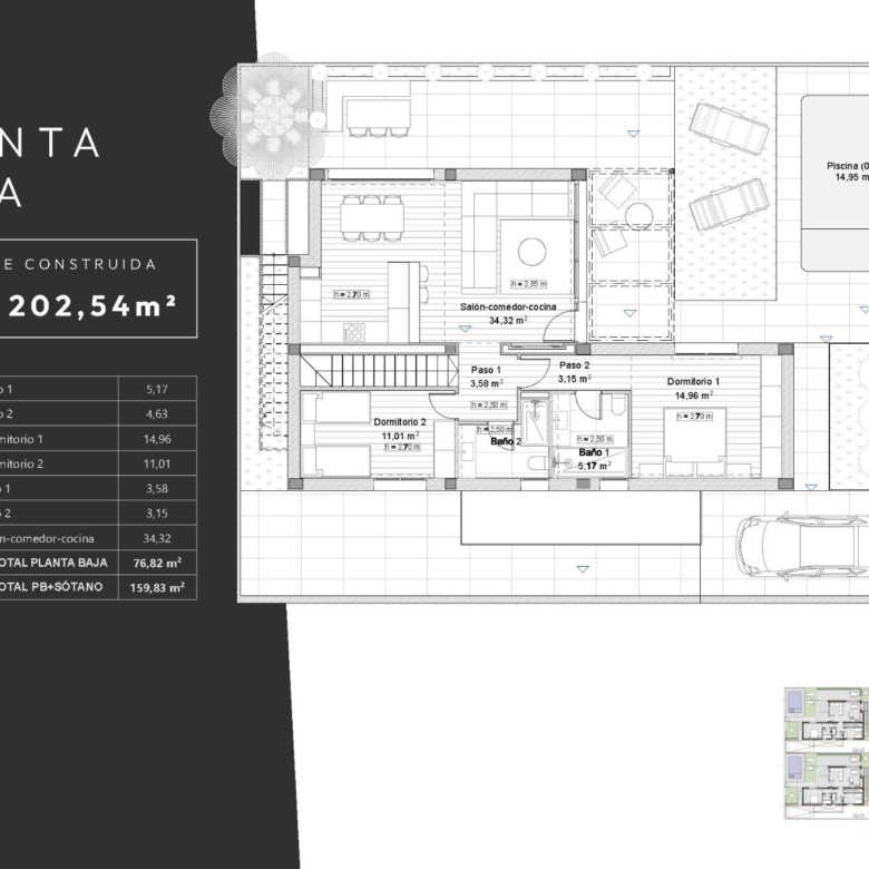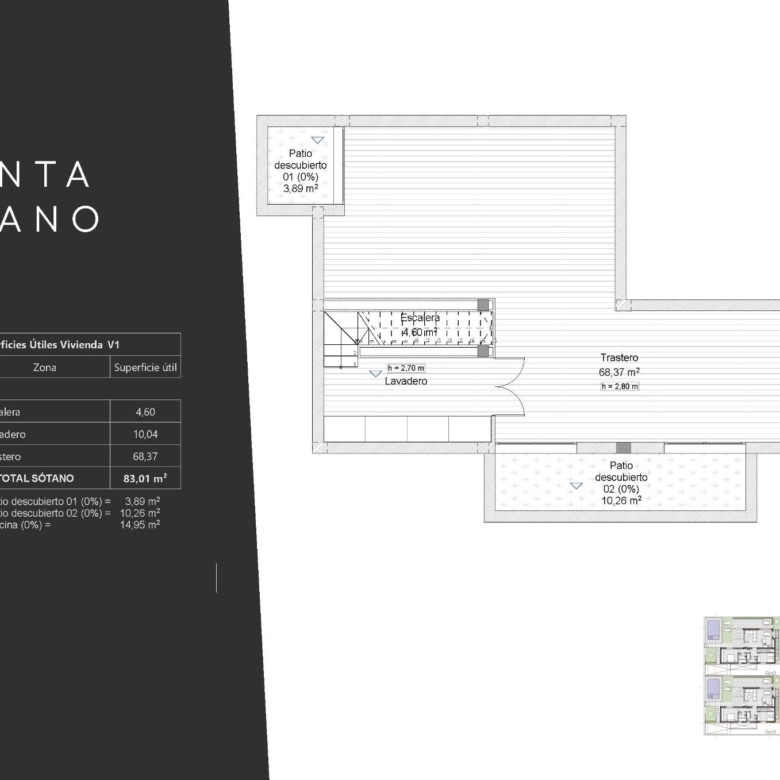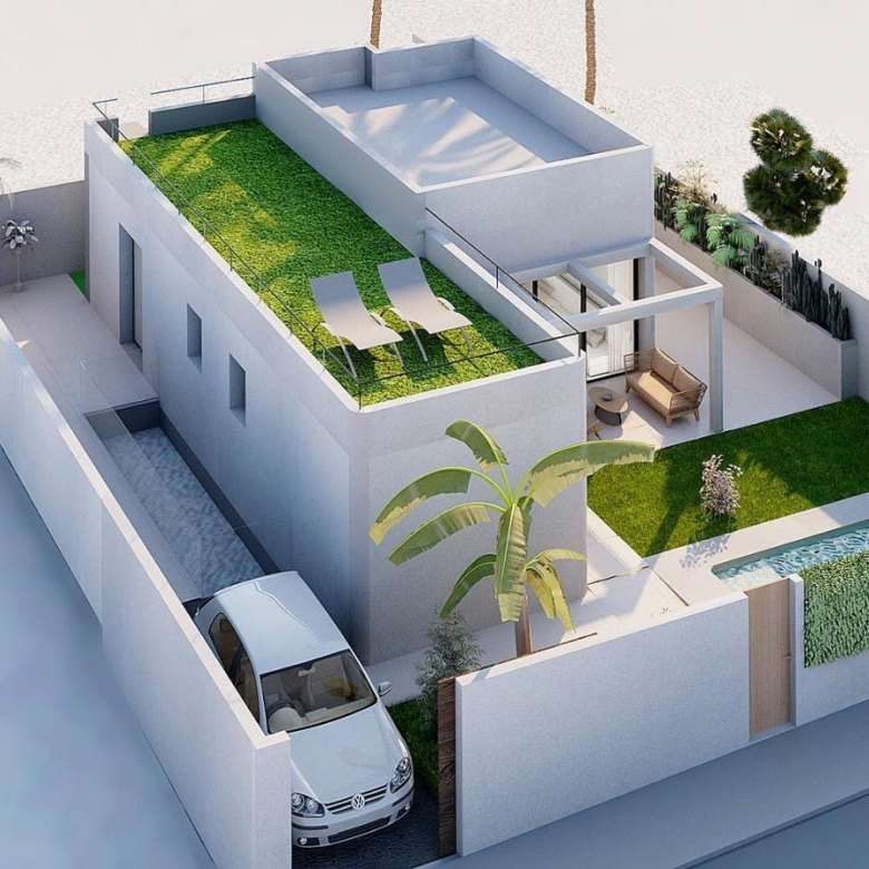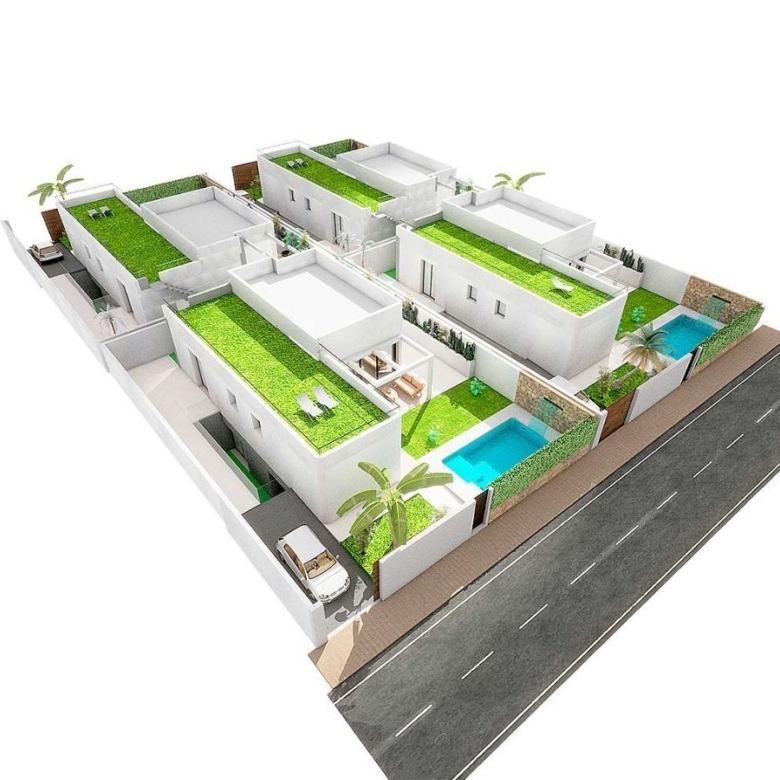 De villa’s hebben ook een solarium van 60 meter, afgewerkt met kunstgras en glazen balustrade, fantastische kelder die de woningen hebben, van meer dan 80 meter, die een wasruimte heeft en twee Engelse patio’s die licht en natuurlijke ventilatie bieden.