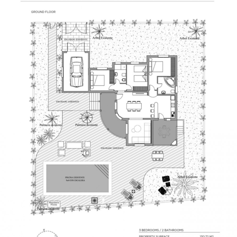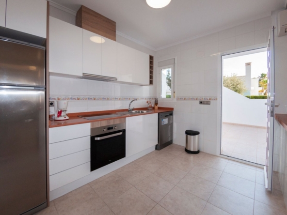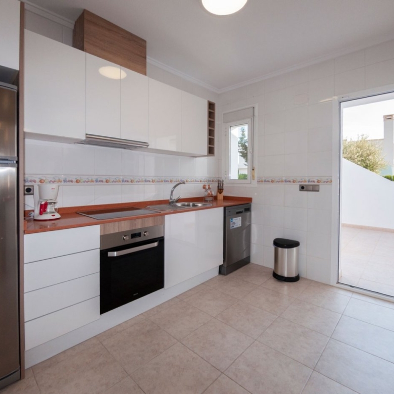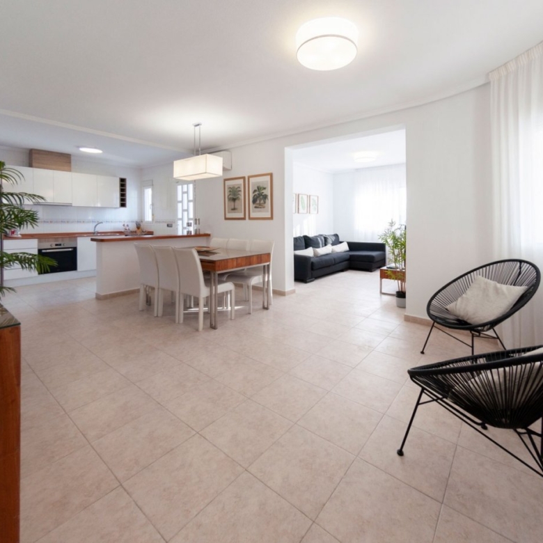Villa met 3 slaapkamers en 2 badkamers, open keuken-eetkamer, woonkamer en terras.