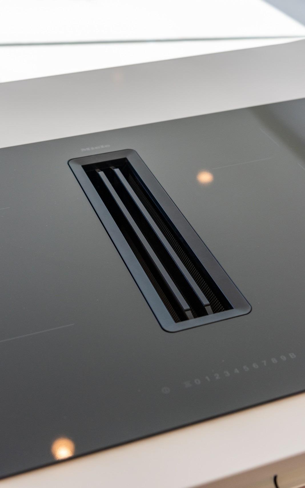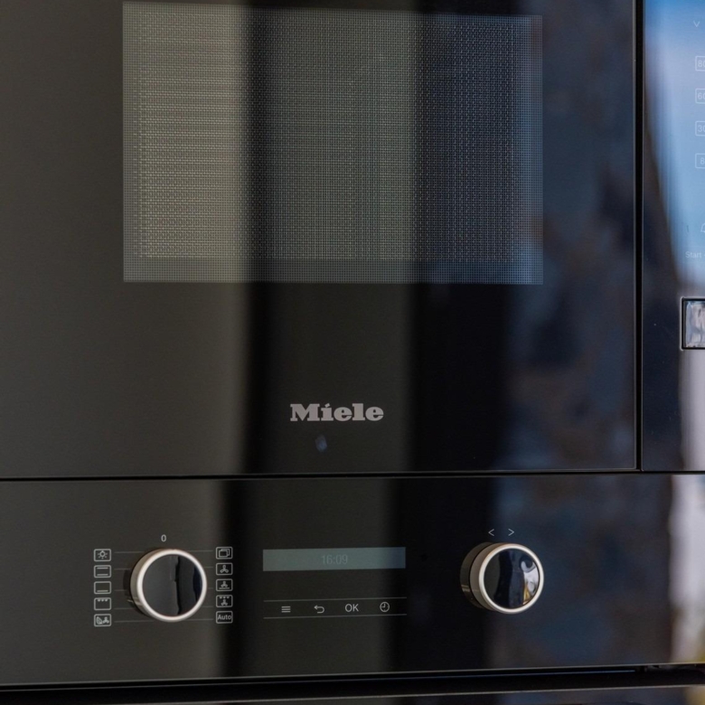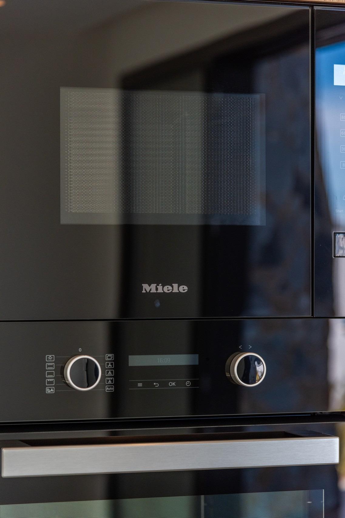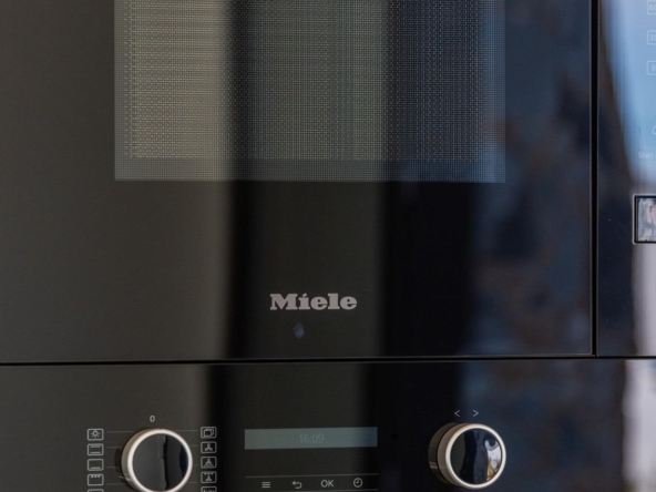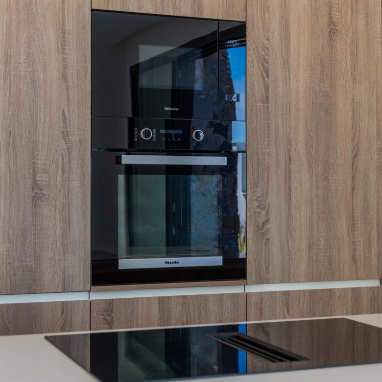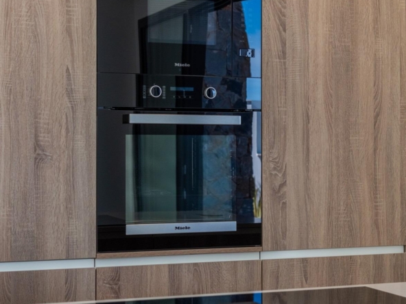 Volledig ingerichte keuken in wit glans of hout kleur omvat Inductie kookplaat met geïntegreerde afzuigkap, oven, magnetron, wasmachine, geïntegreerde koelkast, en geïntegreerde vaatwasser.