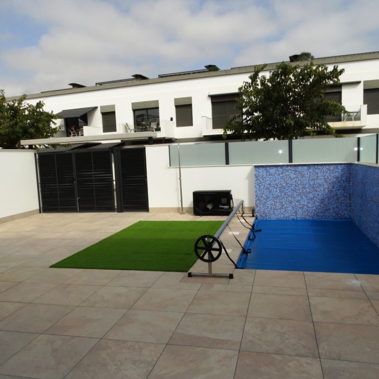 Prachtige woningen met 3 slaapkamers en 3 badkamers, open keuken met woonkamer, inbouwkasten, terras, solarium, privétuin met zwembad en parkeerplaats.