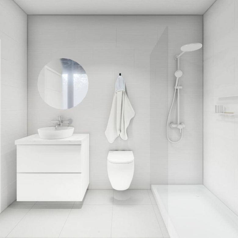 Volledig ingerichte badkamers met hangend toilet, doucheschermen, badmeubel, spiegel met licht en regendouche.