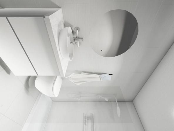 Volledig ingerichte badkamers met hangend toilet, doucheschermen, badmeubel, spiegel met licht en regendouche.