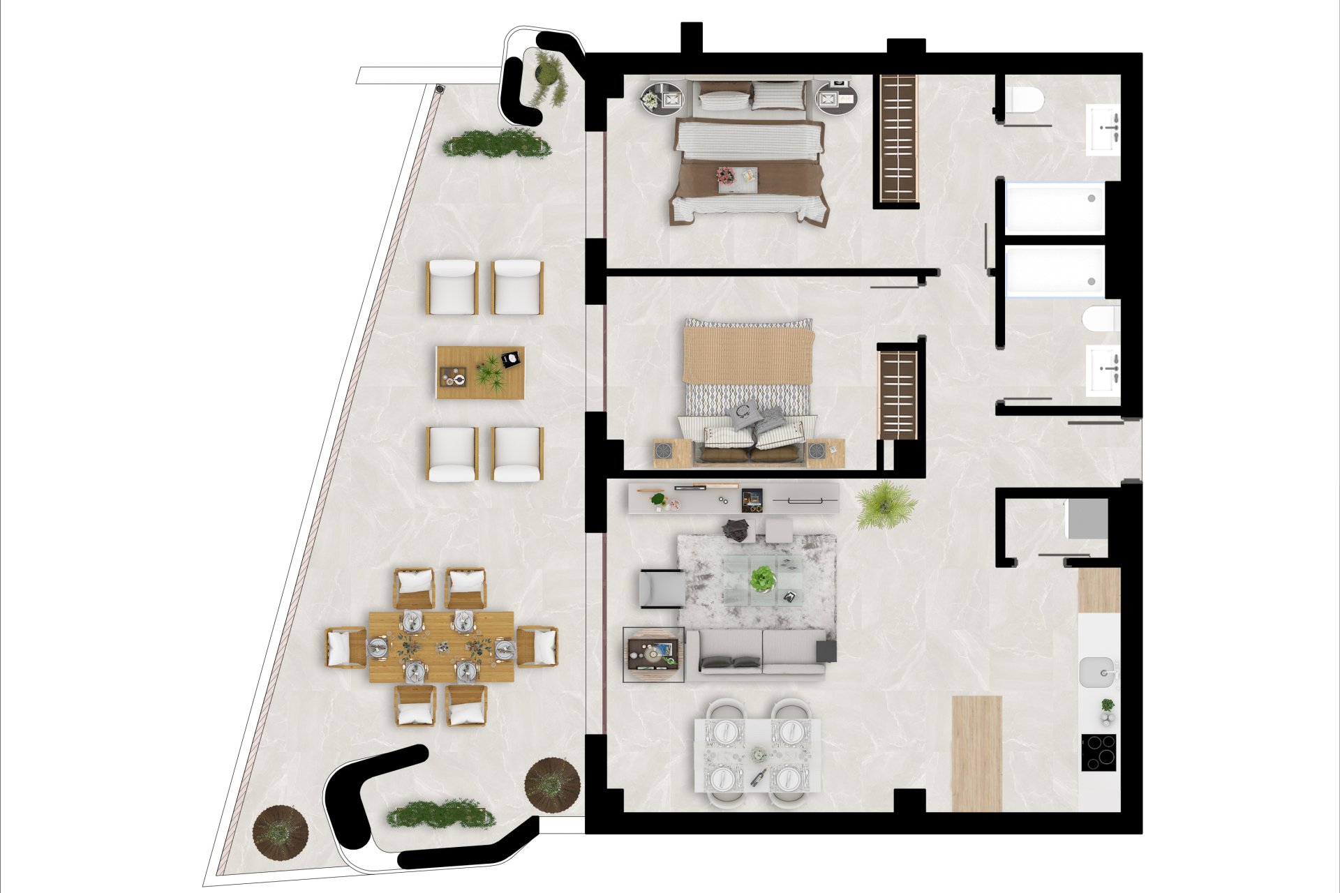 The outdoor spaces of this residential complex in Benahavís are designed to offer a relaxing and pleasant environment. Each property features a private terrace, ideal for enjoying the Mediterranean climate and outdoor moments. Additionally, ground floor homes have direct access to garden areas, providing additional space for leisure and relaxation. The solarium is another highlight, offering a perfect spot for sunbathing or enjoying the views of the natural surroundings that envelop the complex.