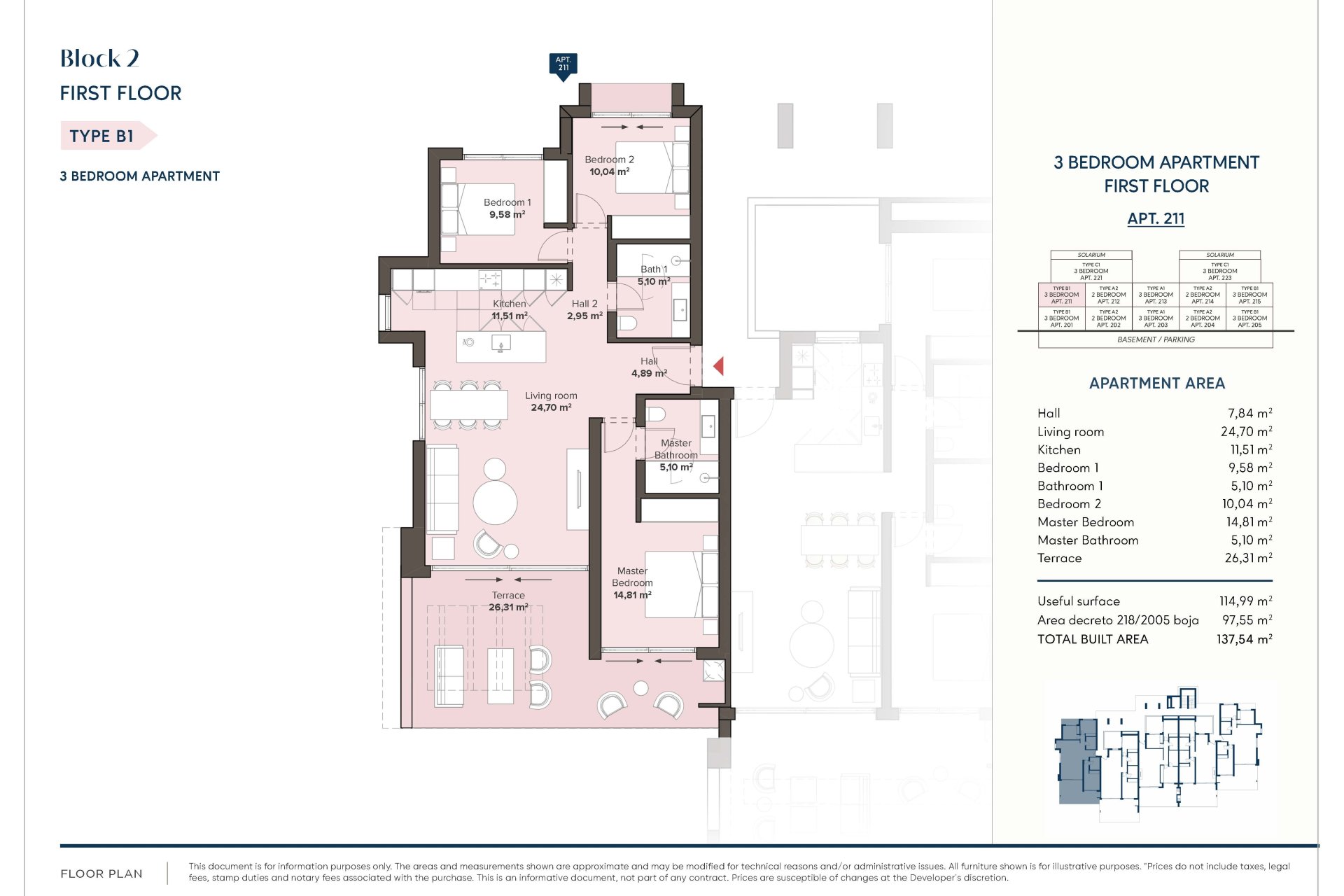 The exteriors of these properties are designed to maximize enjoyment of the Mediterranean climate. Each home features a private garden, ideal for relaxing outdoors or enjoying family gatherings. Additionally, the spacious terraces provide extra space to enjoy the views and dine al fresco. For those seeking a more exclusive space, the solarium is the perfect place to sunbathe in privacy. The proximity to the sea, just 1 km away, allows for beach walks and water activities.