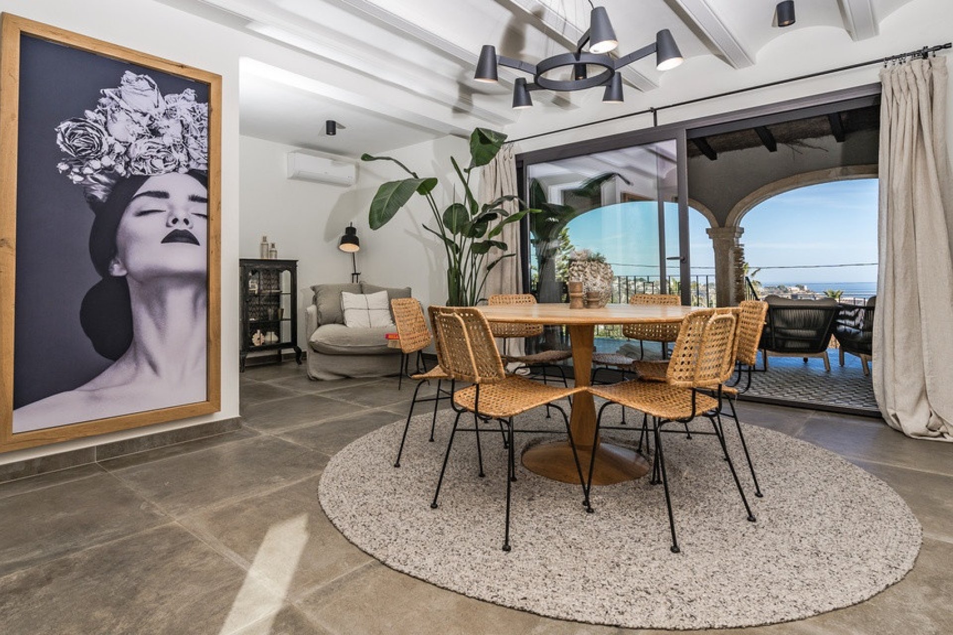 While the exterior charms with an outdoor dining area and barbecue space shaded by refreshing Balinese umbrellas, the interior impresses with its warmth and refined elegance. A harmonious blend of styles and carefully curated details flows throughout the open-plan kitchen and living-dining area, giving this Mediterranean-style villa a truly distinctive character. Traditional elements such as balustrade columns and arched terraces beautifully frame the panoramic views of the sea and mountains.