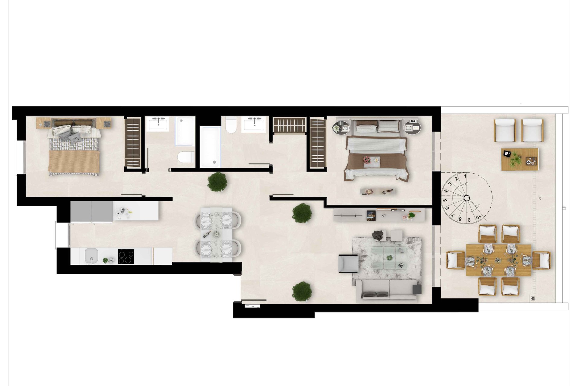 Each property is equipped with high-quality features that ensure a comfortable and modern lifestyle. Porcelain floors add a touch of elegance and durability, while electric blinds provide an additional level of convenience. The kitchens are fully equipped with modern appliances, facilitating daily life. Built-in wardrobes offer ample storage space, optimizing the use of interior space. The properties have 2 or 3 bedrooms and 2 bathrooms, adapting to different family needs. Additionally, they feature a private garage and a solarium, providing additional spaces for leisure and relaxation.